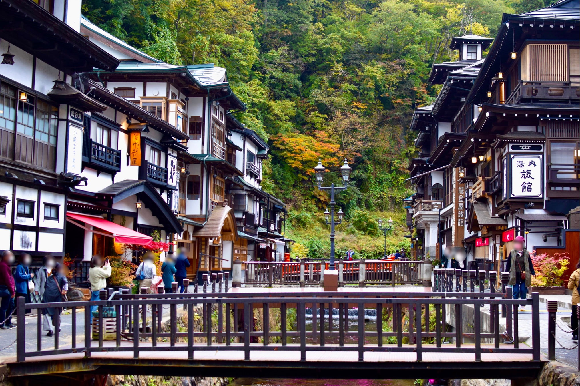 【銀山溫泉】與宮城縣鄰接的山形縣尾花澤市內有一座沿著銀山川溪谷的銀山溫泉,銀山川清冽的河水冒著熱氣穿流其中,這裏有成排的3、4層樓木結構的旅館,氣氛寧靜,宛如世外桃源。五百多年前這裏發現了銀礦,所以這座溫泉村取名爲「銀山」,人們來到這裏總會産生一種錯覺,以爲到了拍攝日本古代戲的電影村。溫泉街的前端是白銀公園,有一條長長的散步小道,這是洗完溫泉澡後最理想的散步去處,入口處有一個落差22公尺的白銀瀑布,上流有籟音瀑和河床由整塊岩石構成的洗心峽(文殊谷),還有延澤銀礦坑,坑道內有照明,進出約需30分鐘,遊人在這裏可以體驗一下洞窟探險的樂趣。銀山溫泉最出名的景色,就是冬季來臨之際,東北地區的地面覆蓋上層層白雪,點綴在古老的溫泉街區,昏黃的煤氣燈映照著川流兩岸,形成難以忘懷的夢幻畫面。除此之外,兩旁大正浪漫時期的溫泉旅館,以及銀山溫泉悠久的歷史,也是令人留連忘返的原因。