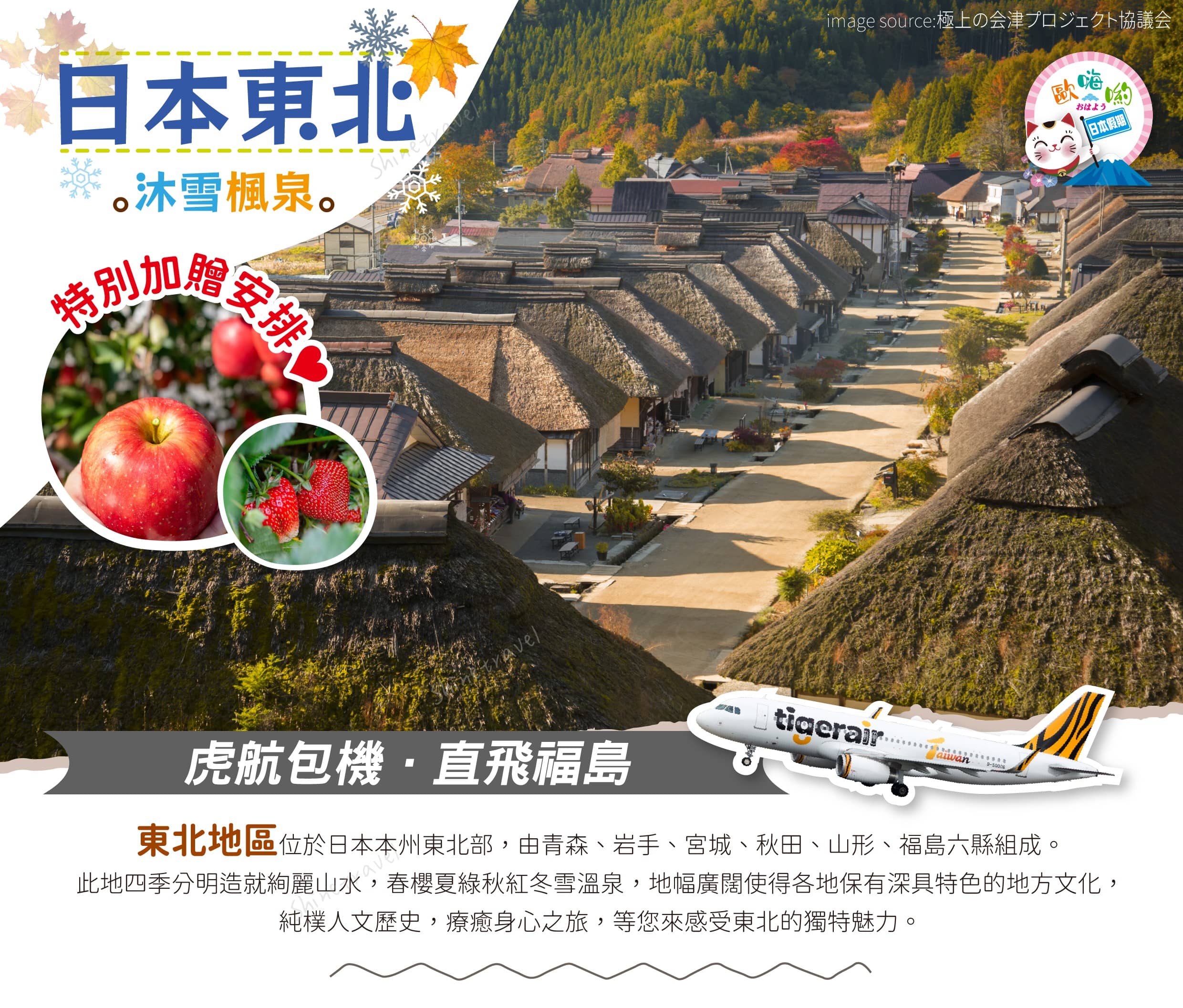 今日集合於台灣桃園國際機場,辦理出境手續後,搭乘豪華客機直飛東北【福島國際機場】