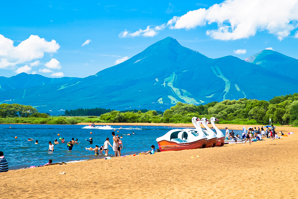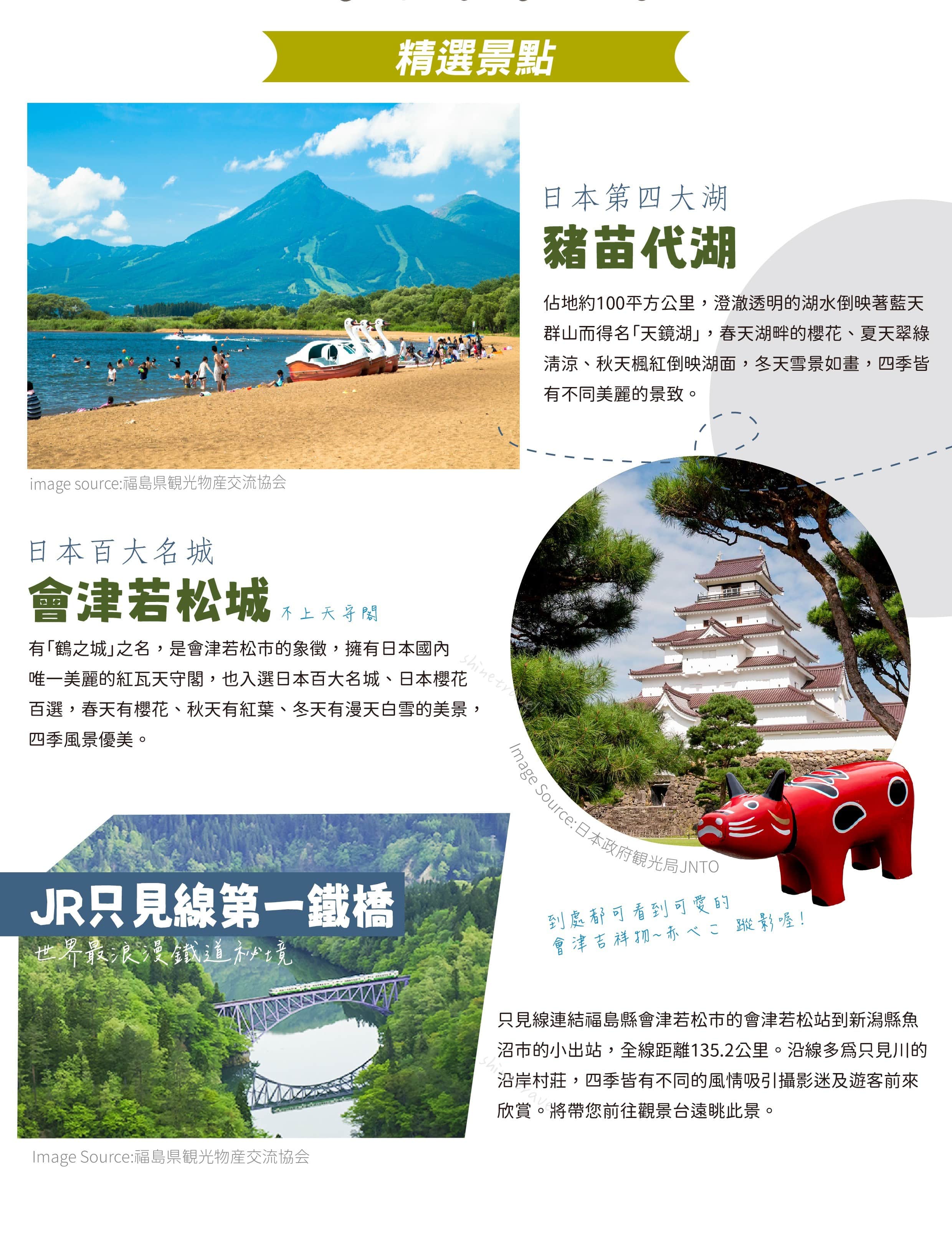 【豬苗代湖】位於日本福島縣會津若松市、郡山市、耶麻郡豬苗代町間的湖是全日本第四大湖,猶如天鏡把磐梯山的英姿映照在湖面上,也稱作「天鏡湖」,豬苗代湖的特點是水質清澈乾淨,而且由於流入湖中的長瀨川是火山酸水,水質屬於弱酸性貧營養湖,作為國家指定的天然紀念物、苔蘚群落、天鵝的遷徙地,被指定為擁有寶貴生態系統的地區。春天賞花、夏天賞新綠、秋天賞楓、冬日賞冰,一年四季遊客絡繹不絕。後專車前往飯店。