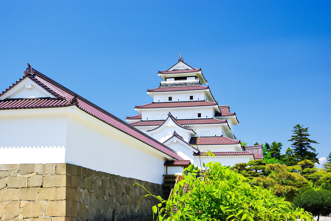 【會津若松城】最早建於西元1384年,迄今有六百多年歷史,此城天守閣之造形有如展開兩翼在空中飛舞的白鶴,姿態優美,因此有「鶴城」之美稱。