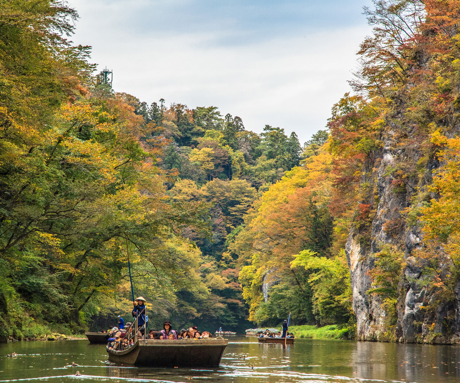 【猊鼻溪】名列「日本百大美景」之一,沿著砂鐵川,五十公尺以上的懸崖在溪谷中延綿二公里。日本全國只有這裡能看到靠一根櫓往返河上的泛舟。船夫唱的《猊鼻追分》加上清流水聲,形成美好旋律,聲聲入耳,令人心醉。透明度高的河水裡能看到魚兒們悠游其中,還能從船上餵食飼料。