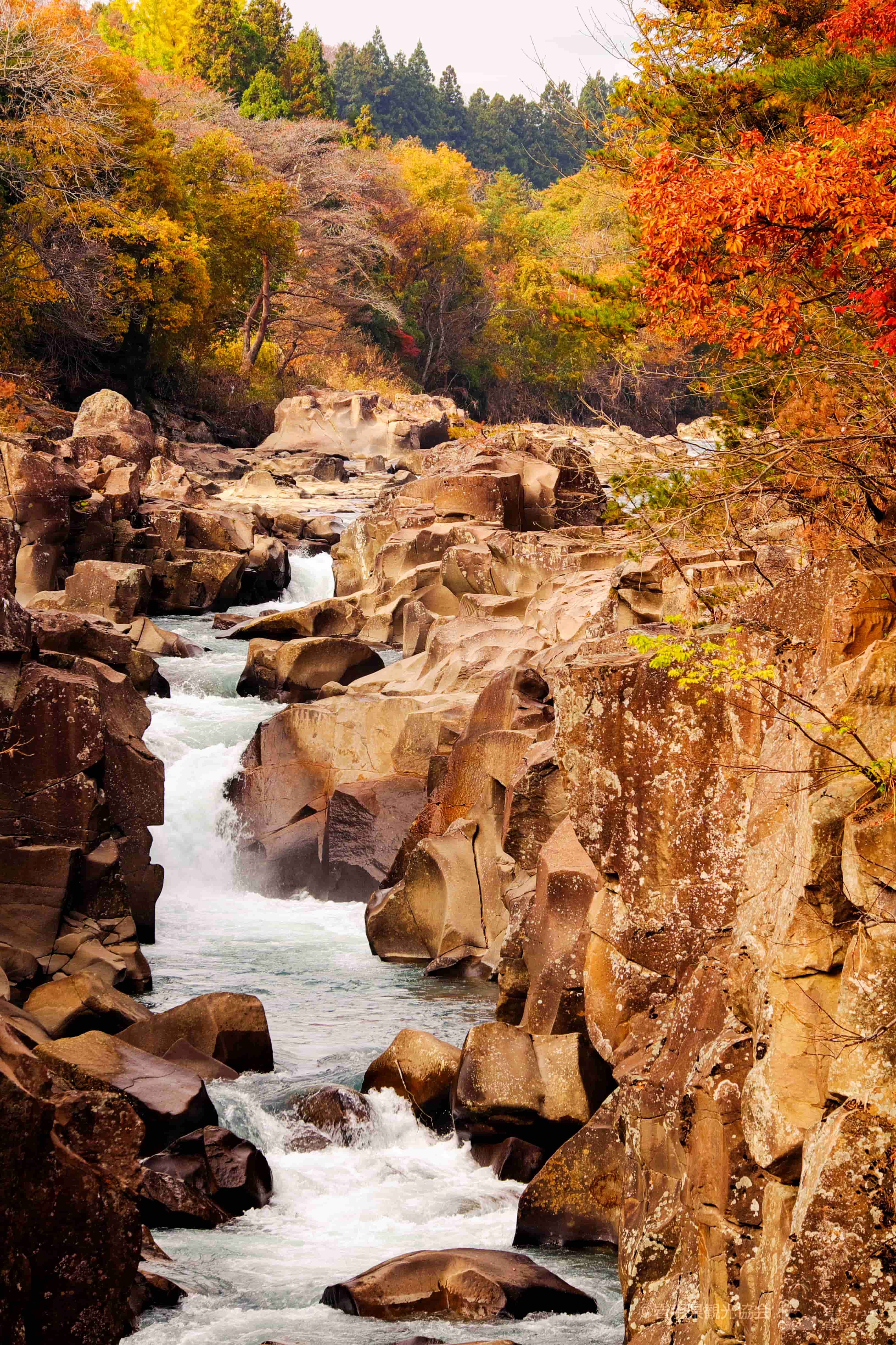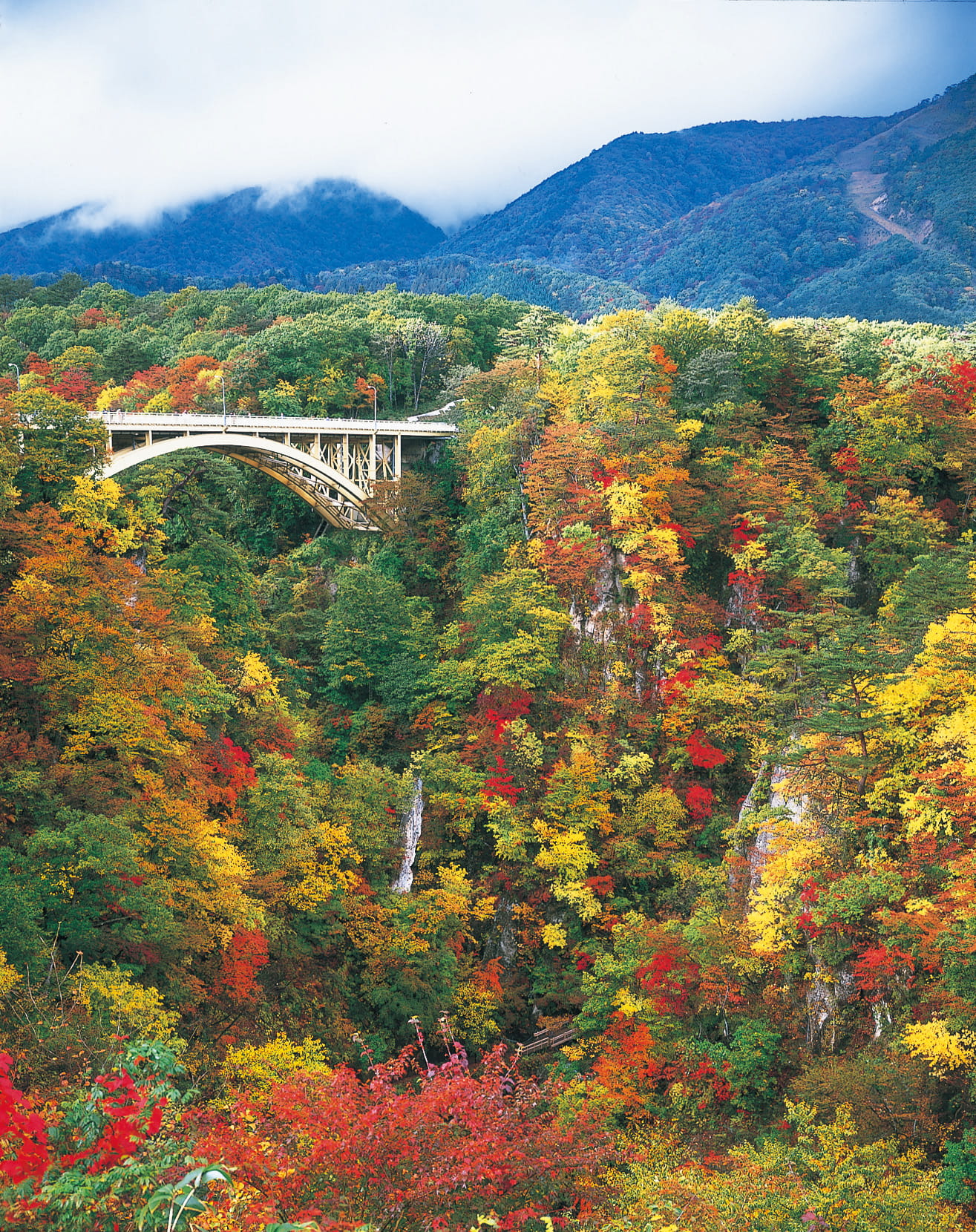 【鳴子峽】是因大谷川侵蝕形成的大峽谷,位於栗駒國家公園內。懸崖延綿約100公尺,眾多奇岩與岩石長出的樹木形成雄偉景觀,這裡也是東北數一數二的賞楓景點,楓紅妝點下的峽谷景色令人屏息!從樹葉間露出的白色岩石更襯托出樹葉的鮮艷色澤,從鳴子峽rest house的瞭望台、瞭望甲板能遠眺美麗景色。