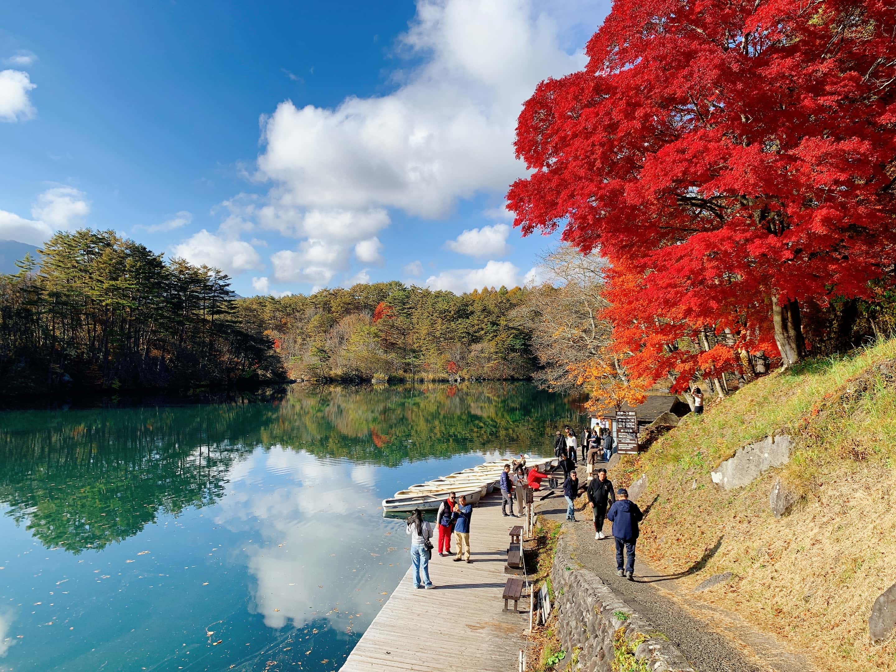 【五色沼】坐落於磐梯高原,好幾個水面顏色不同的湖泊總稱。由於從地底湧出的礦泉含有鐵、錳等大量礦物質,湖中的湧泉又使水的濃度産生變化,生長於沼底的水草和豐富的浮游生物,加上日光晝夜四季交替的因素,呈現出翠綠、湛藍、深紫、咖啡等各種神秘色彩,鮮豔的色彩令人陶醉。