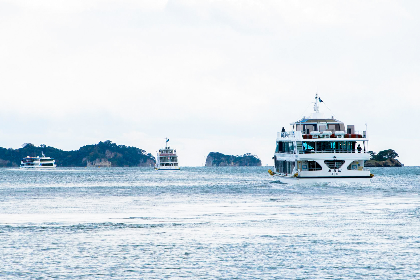 【松島棧橋搭船遊覽松島灣】特別安排搭乘松島灣遊覽船,穿行於擁有約260個大小島嶼上有天然黑松的松島灣內,船內介紹著水面上島嶼奇特的形狀和昆布、牡蠣養殖場,船外更有美麗的海鷗一路相隨,等著表演空中接食的絕技。