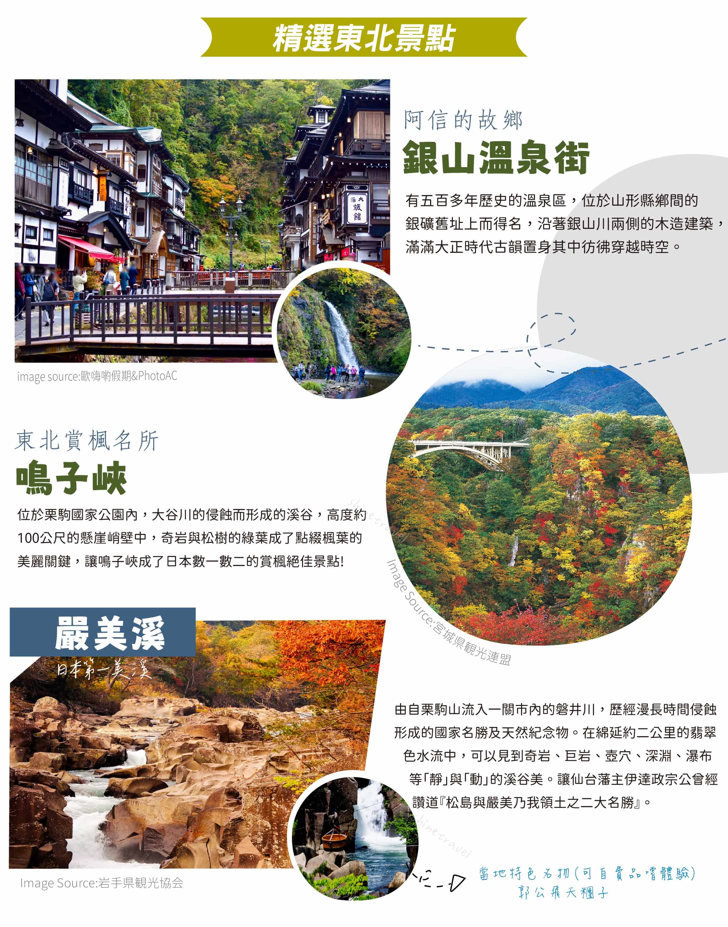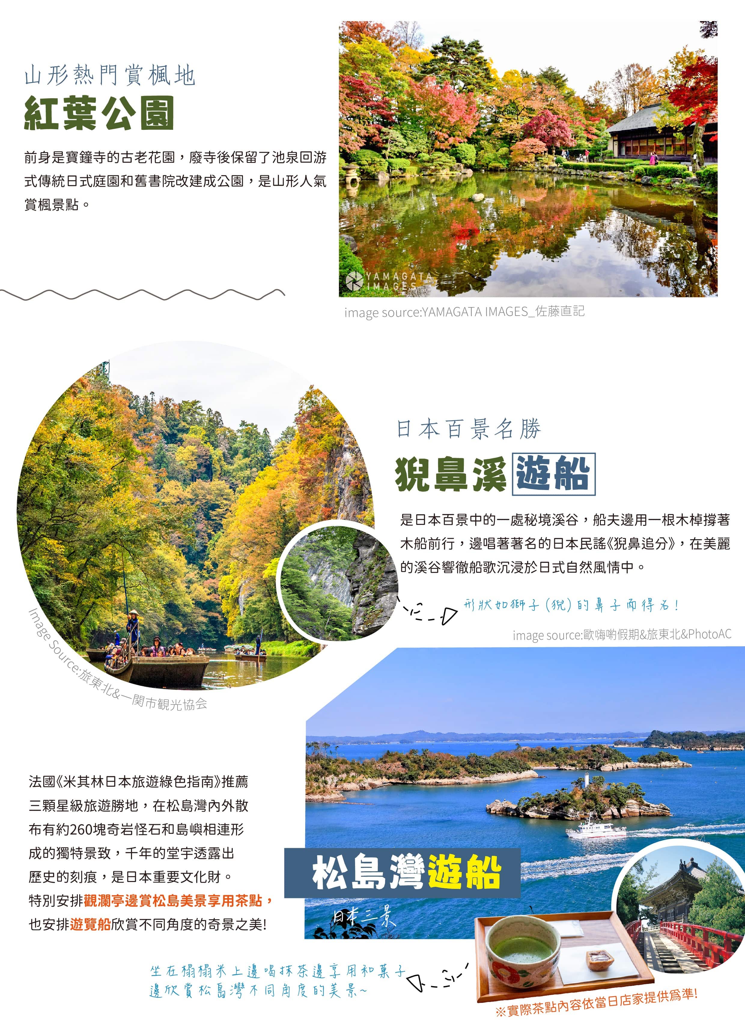 楓紅彩妝日本東北~浪漫銀山溫泉.鳴子峽.猊鼻溪&松島雙遊船.世界遺產中尊寺.採果樂.賞楓秘境雙溫泉精緻5日【週五出發】