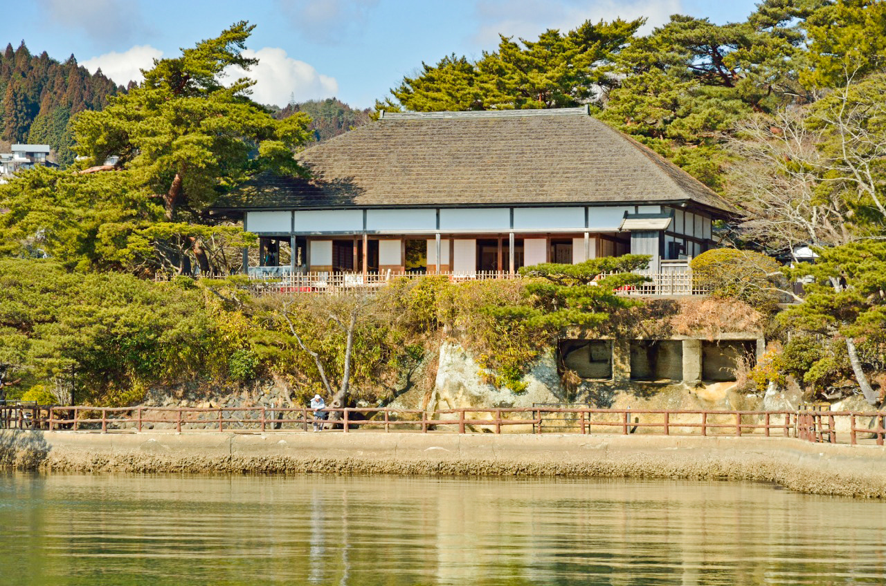 【觀瀾亭】建於松島海岸小丘上的茶室,能在此賞瀾(漣漪)。據傳伊達政宗從豐臣秀吉手中接收原先位於伏見桃山城的茶室後,移往江戸藩邸;第二代藩主—忠宗則再將茶室原封不動地移到能欣賞松島灣美景的現在位置。當年眾多政要曾到此遊覽、住宿,高格調的建築物十分豪華,獲指定為日本國家重要文化財產。