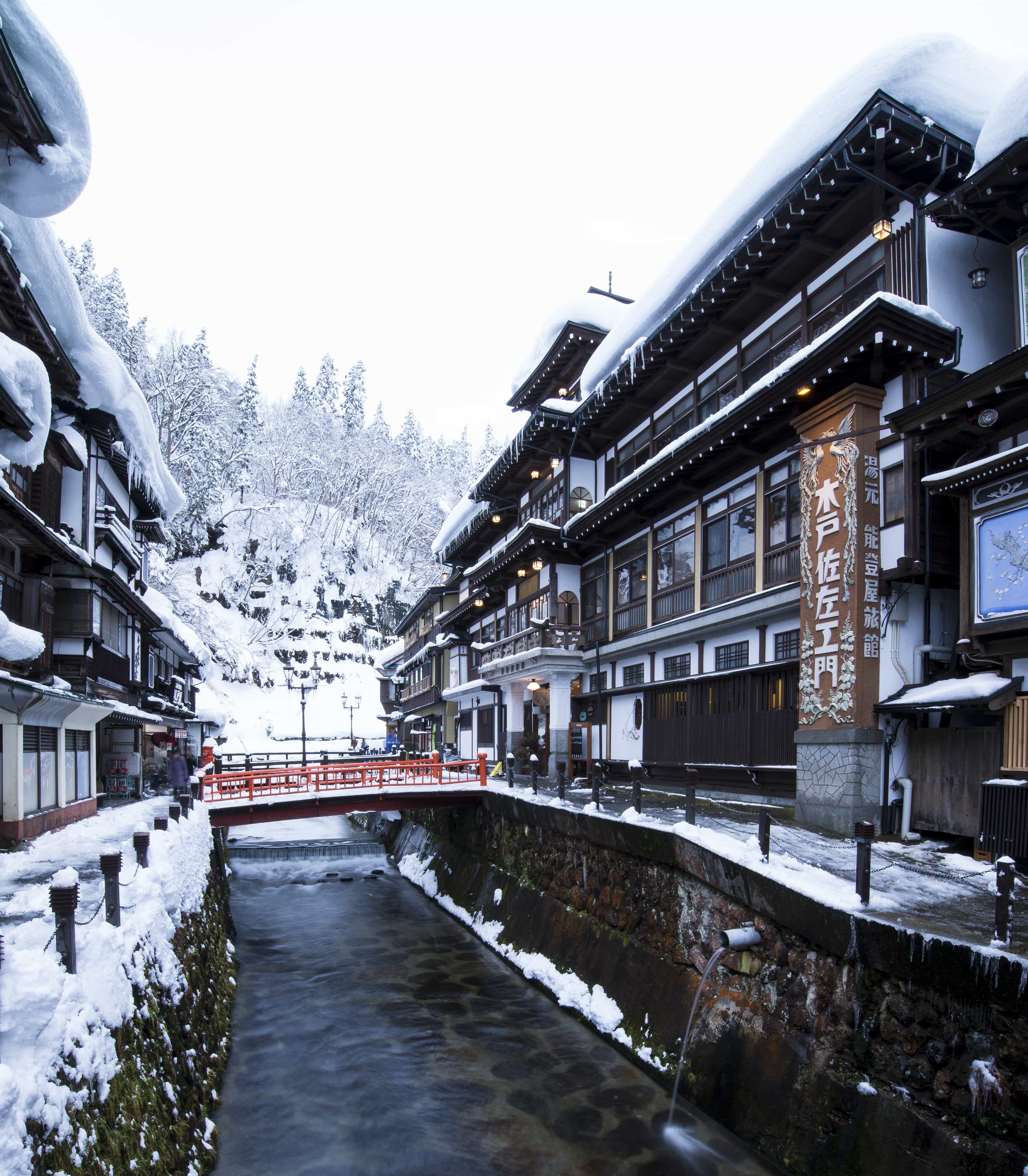 【銀山溫泉】與宮城縣鄰接的山形縣尾花澤市內有一座沿著銀山川溪谷的銀山溫泉,銀山川清冽的河水冒著熱氣穿流其中,這裏有成排的3、4層樓木結構的旅館,氣氛寧靜,宛如世外桃源。五百多年前這裏發現了銀礦,所以這座溫泉村取名爲「銀山」,人們來到這裏總會産生一種錯覺,以爲到了拍攝日本古代戲的電影村。溫泉街的前端是白銀公園,有一條長長的散步小道,這是洗完溫泉澡後最理想的散步去處,入口處有一個落差22公尺的白銀瀑布,上流有籟音瀑和河床由整塊岩石構成的洗心峽(文殊谷),還有延澤銀礦坑,坑道內有照明,進出約需30分鐘,遊人在這裏可以體驗一下洞窟探險的樂趣。銀山溫泉最出名的景色,就是冬季來臨之際,東北地區的地面覆蓋上層層白雪,點綴在古老的溫泉街區,昏黃的煤氣燈映照著川流兩岸,形成難以忘懷的夢幻畫面。除此之外,兩旁大正浪漫時期的溫泉旅館,以及銀山溫泉悠久的歷史,也是令人留連忘返的原因。