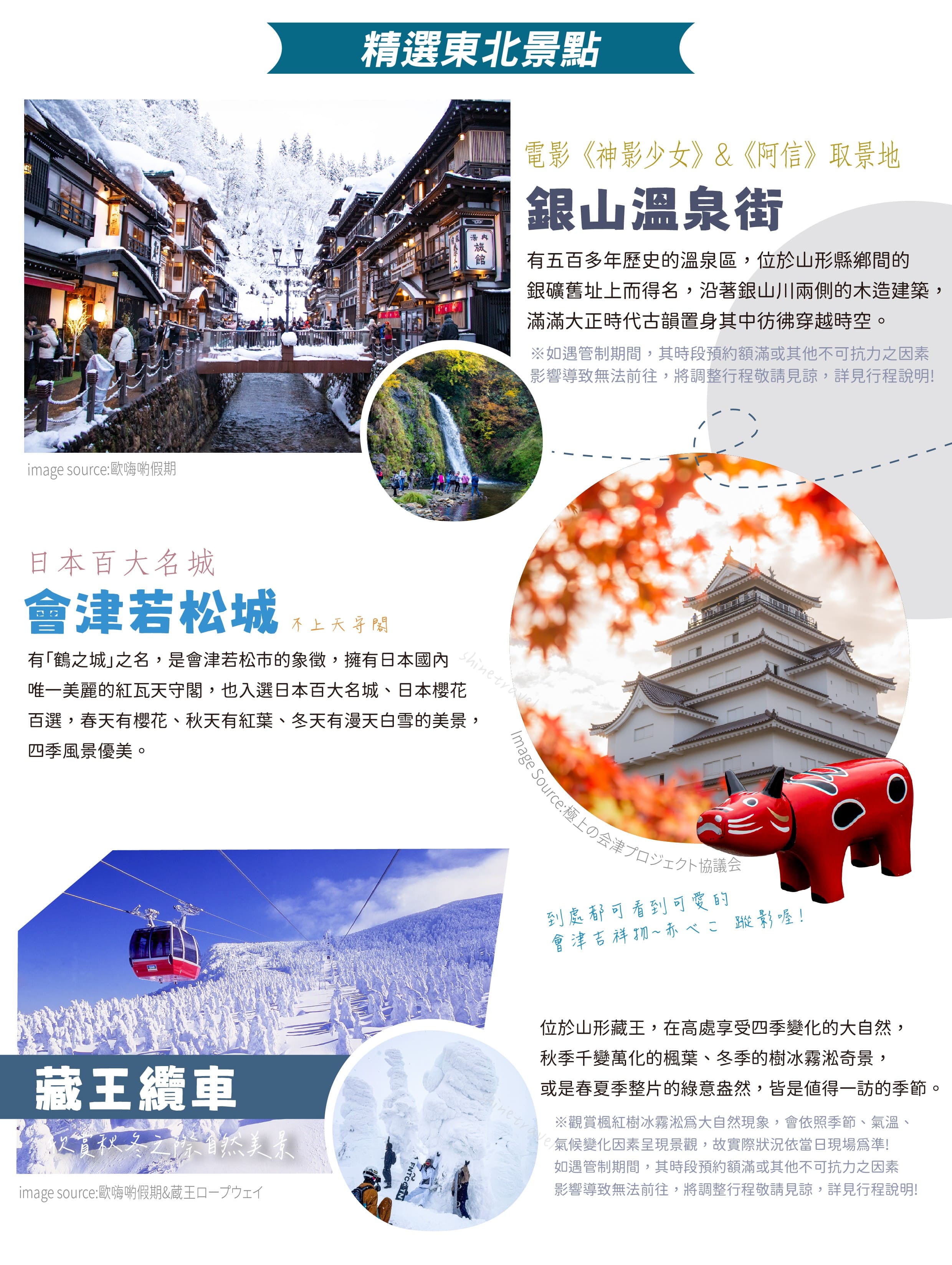 ※備註說明:因銀山溫泉實施時段人數管制公告,實施期間為12月初至2026年3月底(詳見官網公告),如遇時段預約額滿或其他不可抗力因素之影響導致無法前往,將改前往奧州三大名湯~飯坂溫泉街散策,敬請見諒!
