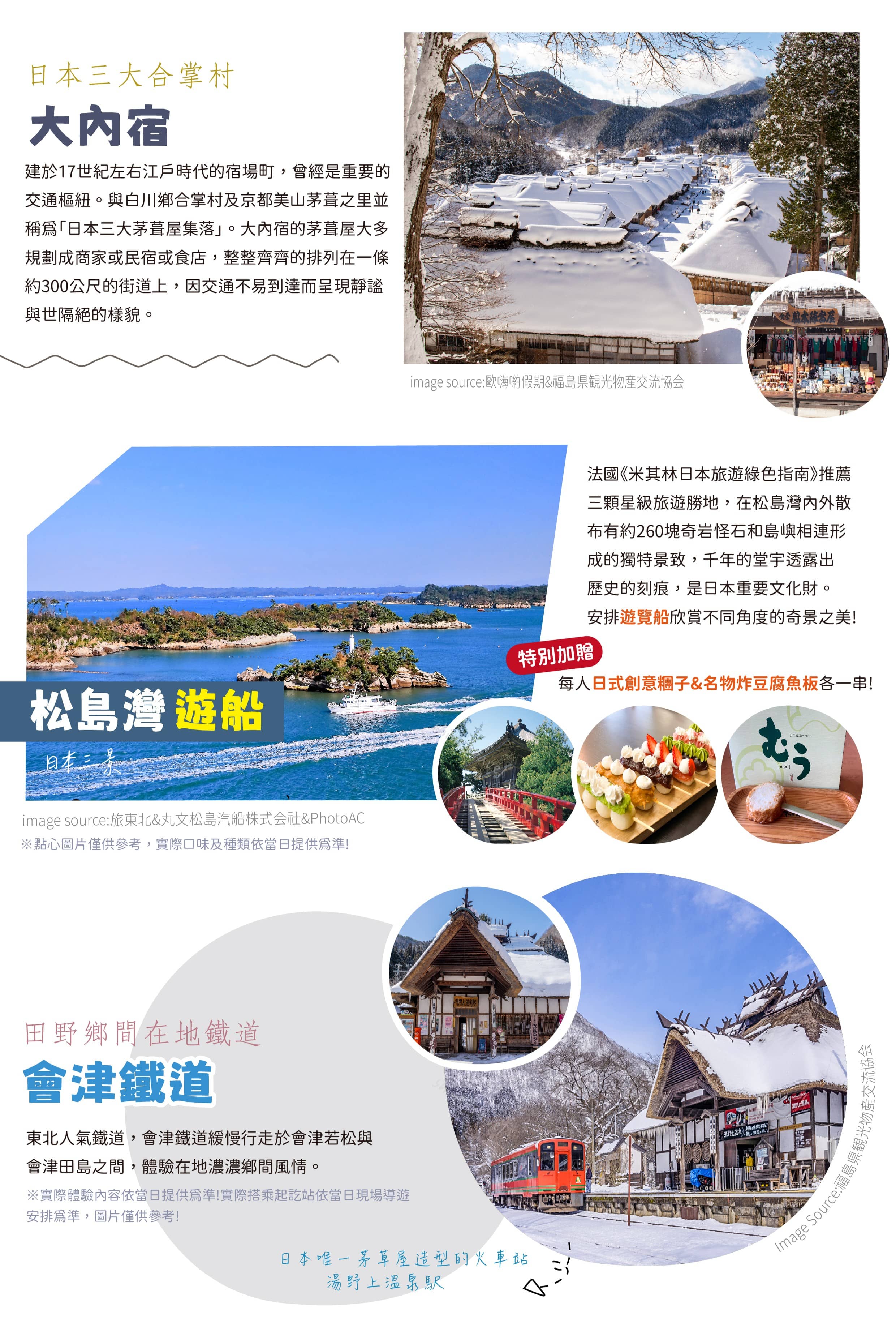 楓花雪月日本東北~藏王纜車.大內宿.松島灣遊船.會津鐵道.銀山溫泉街.高屋敷稻荷神社.採果樂.雙溫泉5日【週五出發】