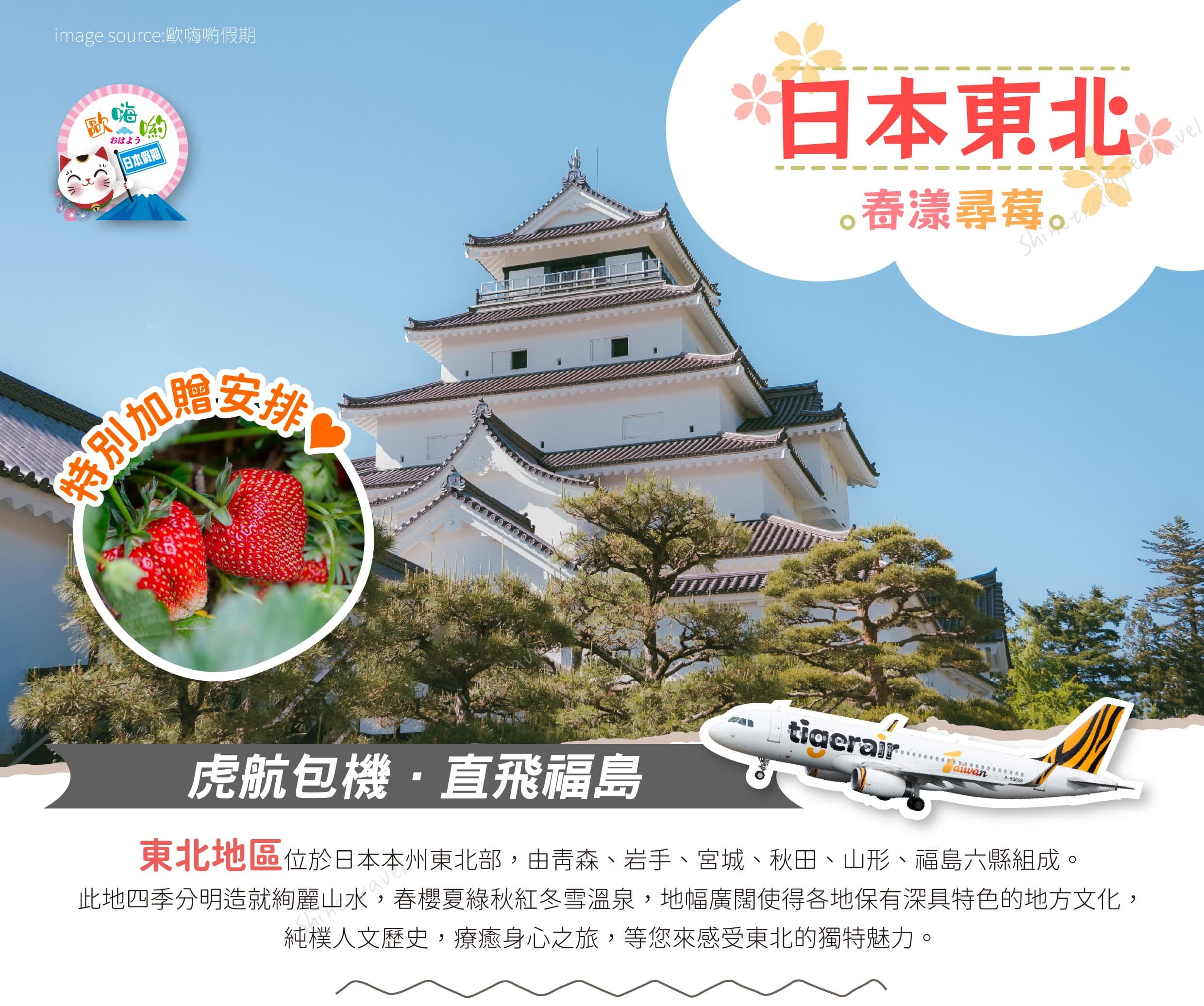 歐嗨喲假期.春漾尋莓日本東北~阿武隈洞.松島遊船.飯坂溫泉.金蛇水神社.鶴之城.鐵道.採果.三溫泉精緻5日【週五出發】