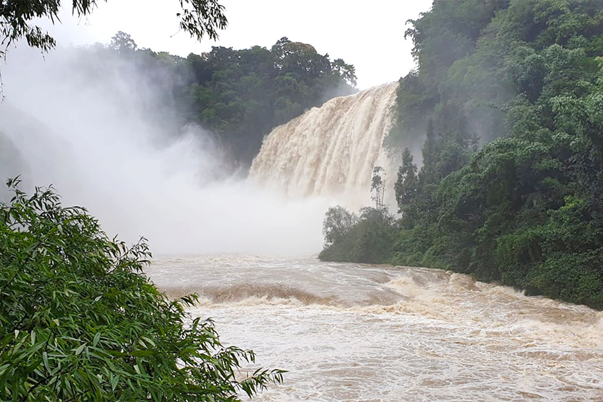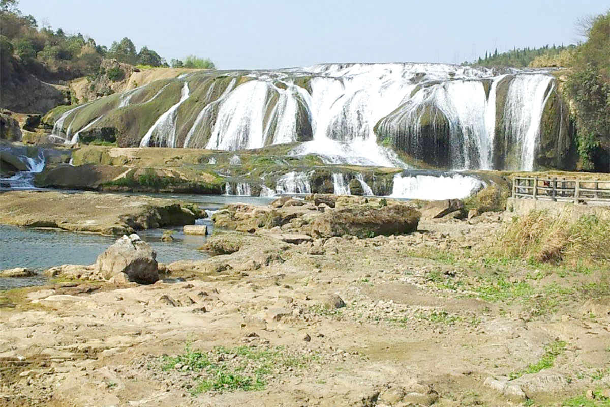 【陡坡塘瀑布】位於黃果樹瀑布上游1公里處,瀑頂寬105米,高21米,是黃果樹瀑布群中瀑頂最寬的瀑布。陡坡塘瀑布頂上是一個面積達1.5萬平方的巨大溶潭,瀑布則是形成在逶迤100多米長的鈣化灘壩上。陡坡塘瀑布還有一個特殊的現象:每當洪水到來之前,瀑布都要發出“轟隆.轟隆”的吼聲,因此又叫“吼瀑”。“遙聞水聲轟轟,從隴隙北望,忽有水自東北山腋瀉崖而下,搗入重淵,但見其上橫白闊數丈,翻空湧雪,而不見其下截,蓋為對崖所隔也。