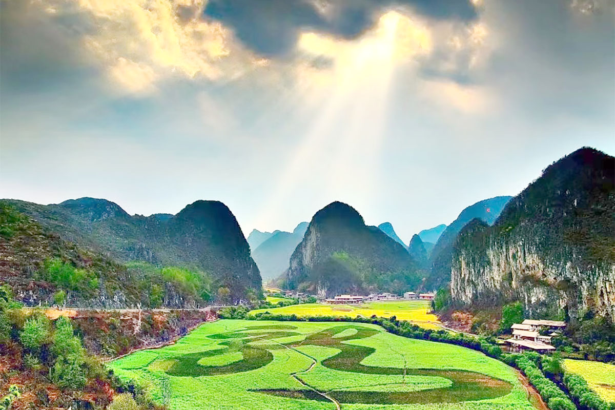 【萬峰林景區】有著「極美」景觀與人文,山巒層疊田園浩瀚,初見動人,再見吸引,三見想忘都難。一位走遍中國名山大川的明朝地理學家徐霞客,就在萬峰林寫下:天下山峰何其多,唯有此處峰成林。讚美這裡的景致。分佈在興義市的東南方,由近兩萬座奇峰所組合而成,山峰奇特,氣勢壯大,是中國三大喀斯特地貌之一。【納灰村】主要從事傳統農業,以水稻、小麥、玉米為主要農作物,以蔬菜、油菜為主要經濟作物,已有300多年曆史,納灰河穿寨而過,整個村寨依河而布,通過古橋村落有機地聯繫在一起,六棵古榕樹散落在村寨中,形成“路隨水走、村隨水布”的獨特水村格局。【八卦田】位於貴州省興義市萬峰林景區內,是一片天然形成的八卦田,平臥在農田中央,其造型神奇迷離,如神匠打造,層疊有序。八卦田中有三個天然地漏,深不見底,被稱為地眼大地的眼睛。這些納灰漏斗群為寬而淺的碟型漏斗。農田耕地以漏斗為中心,弧型展布,構成了奇異的“八卦”圖案。【福字田】景觀採用常規水稻做邊界,紫葉水稻構圖的定植模式,根據田塊大小和視覺效果確定圖案斑塊作業面積,在水稻生長的苗期、花期,通過水稻葉色、花色的自然變化展現特殊色彩效果。