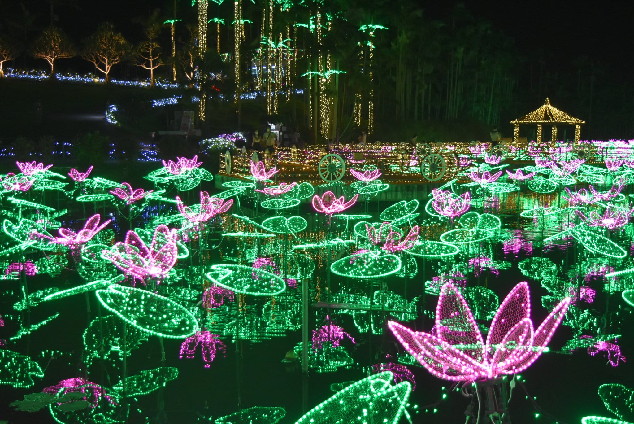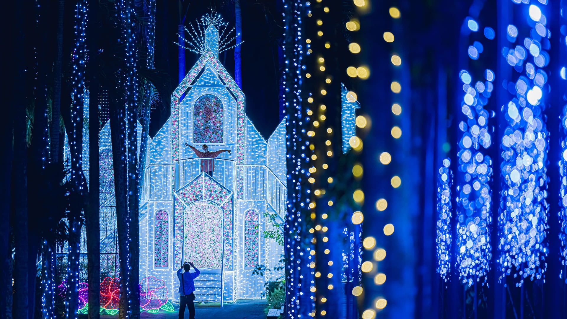 【東南植物園夜間燈光秀】位於沖繩的「東南植物樂園」在入夜後,會從充滿南國風情的植物園搖身一變,成為閃耀奪目的光影幻境。作為「日本三大燈節」之一,園區內400萬顆LED燈與亞熱帶植物交織,營造出如夢似幻的氛圍。最吸引人的是那倒映在水面的蓮花燈飾與宏偉的光之城堡,漫步其間,彷彿置身於星河跌落凡間的神話森林,是冬季沖繩最動人的視覺饗宴。