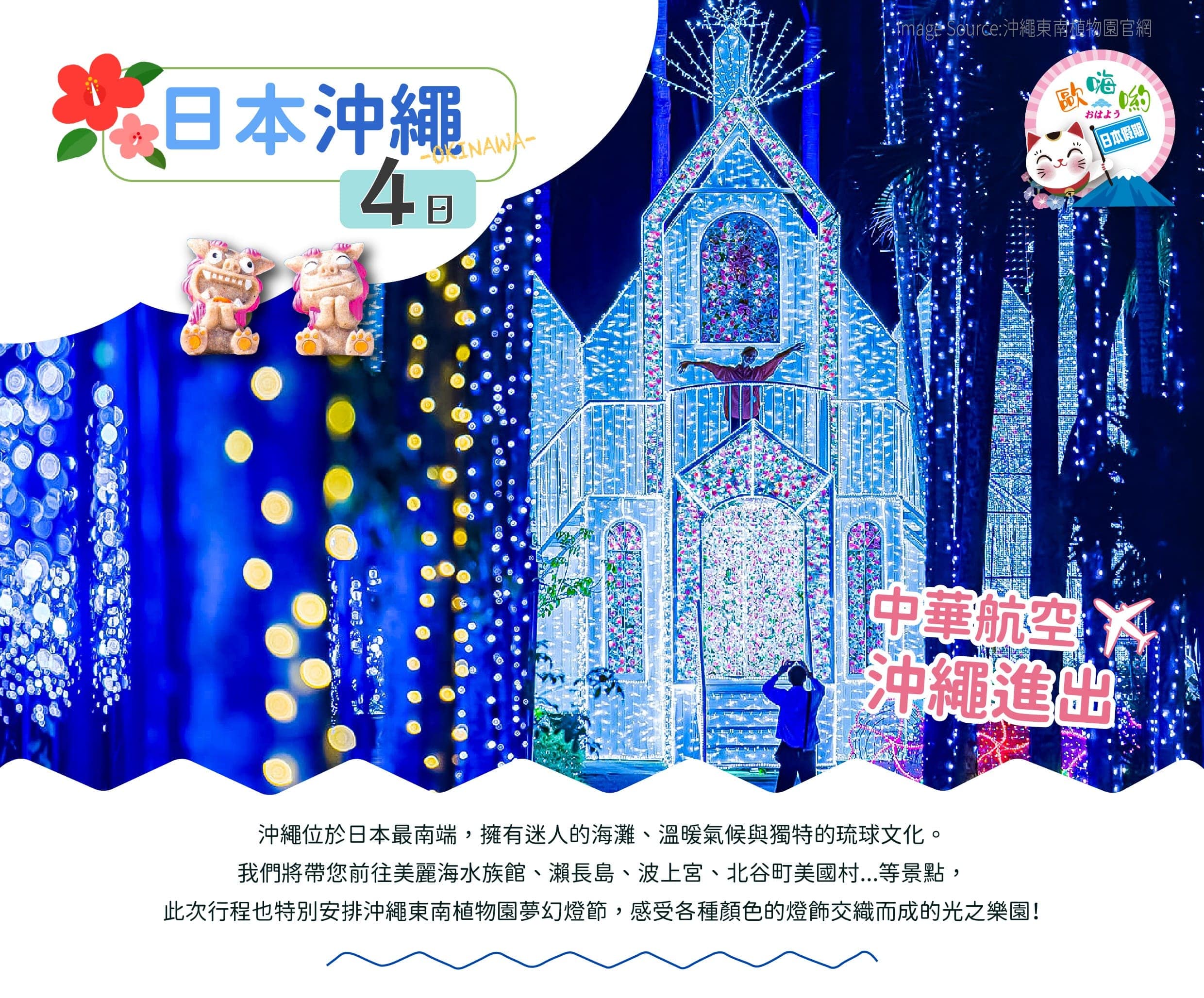 歐嗨喲假期.光影盛宴沖繩~夢幻限定燈節.美麗海水族館.北谷町美國村.波上宮.瀨長島.度假趣4日【中華航空早去早回】