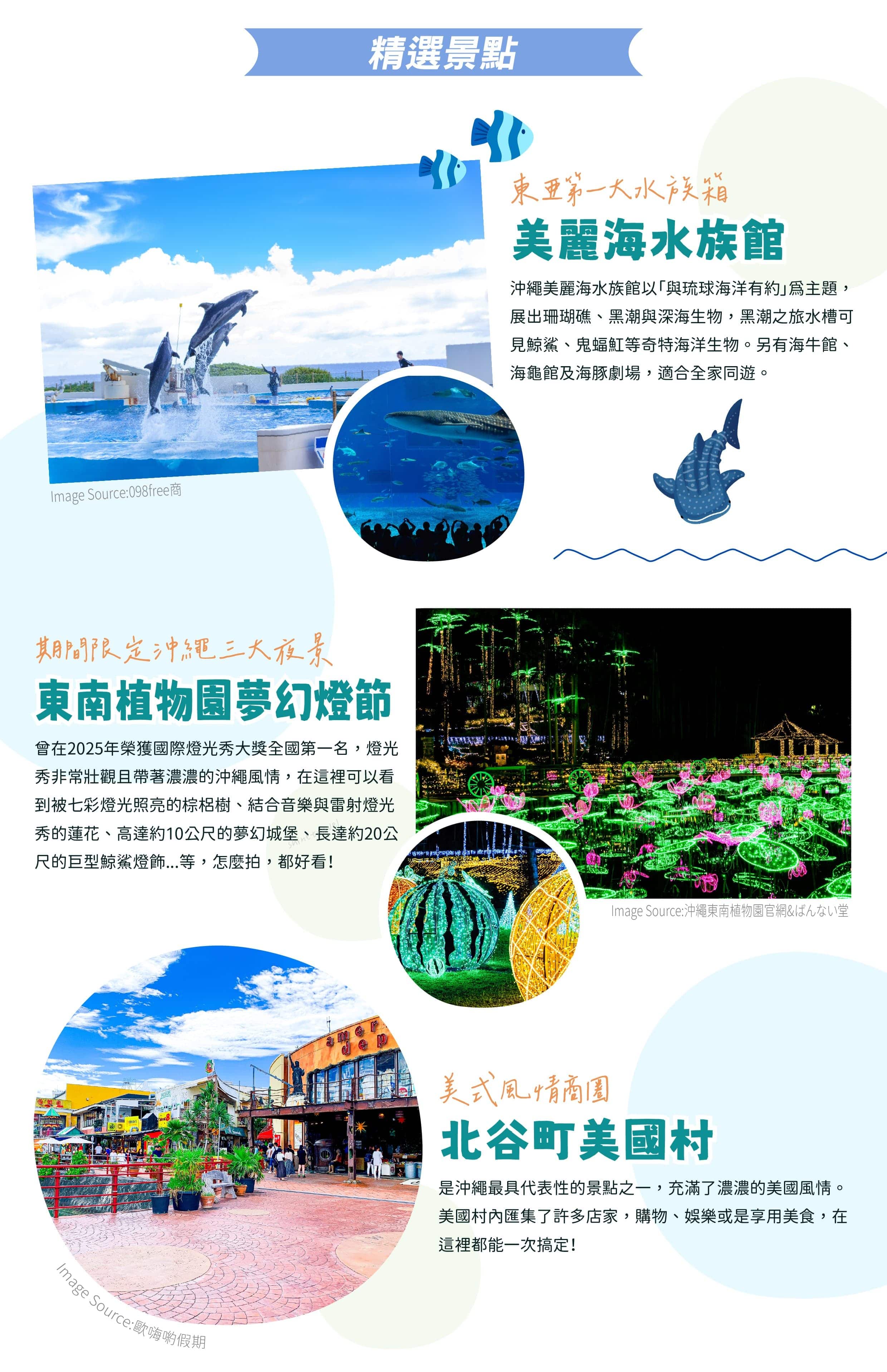 【美麗海水族館】以”與琉球海洋有約”為主題,有3個主題水族箱:珊瑚礁之旅、黑潮之旅及深海之旅,可以讓你全覽沖繩沿海的水中生物,其中最棒的東亞第一大水族箱─黑潮之旅。可以看到細長不超過手掌的條紋蝦魚和毛煙管魚、可長大至14公尺長的7公尺鯨鯊、世界最大的軟骨魚鬼蝠魟、有著黑人厚唇的曲紋唇魚,也可以看到像貌醜惡的石頭魚、章魚、蝦子等等350種奇形怪狀、大大小小的海中生物,令人嘖嘖稱奇,這種滋味就等你來試試囉!另有海牛館、海龜館可參觀,並欣賞可愛的海豚劇場,絕對讓您在此渡過難忘的歡樂時光!