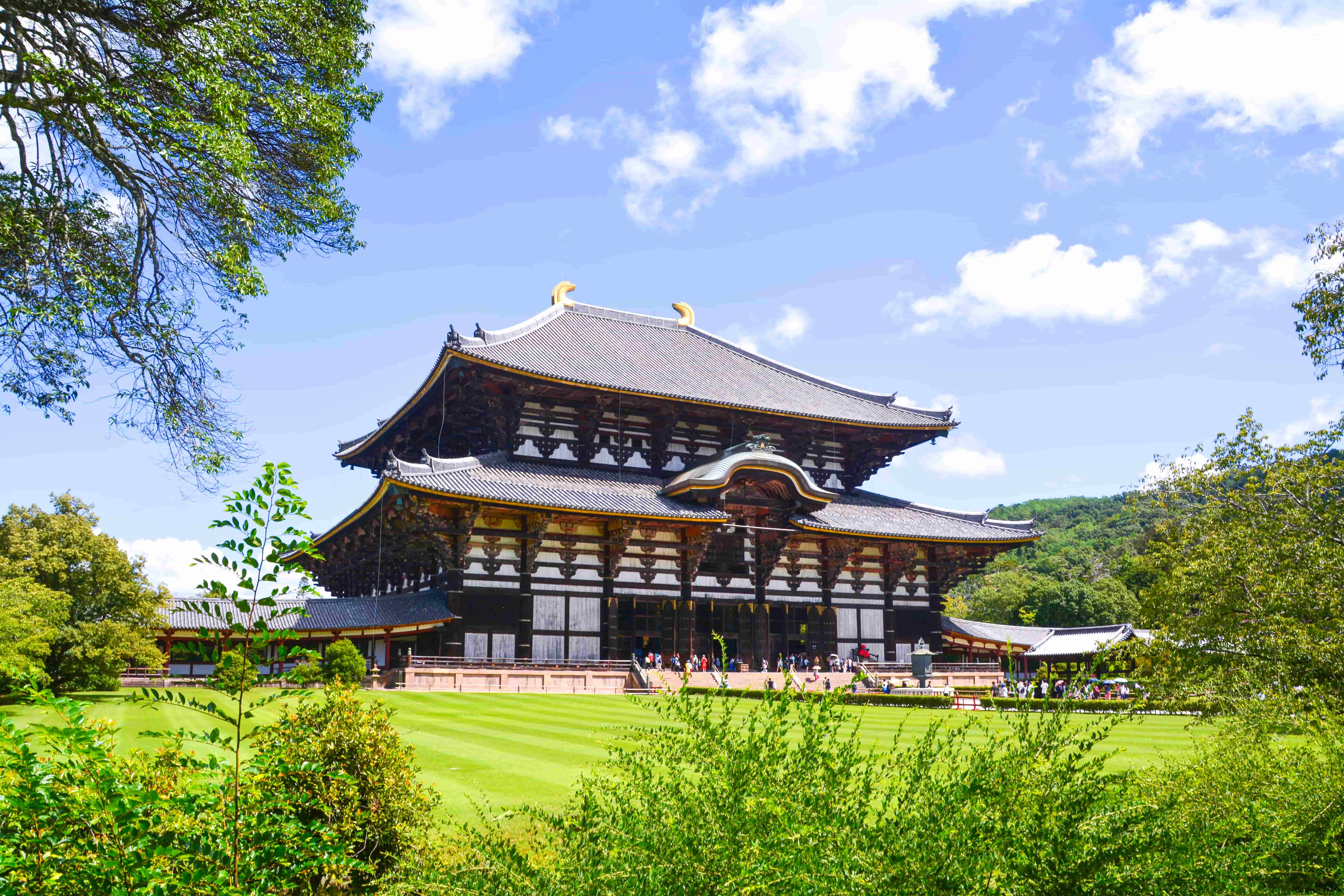 【東大寺】東大寺的建築、雕刻、藝術文物在日本美術史上占有極重要的地位。寺院的特定建築群與唐代最高級的寺院規格相同,如今在全世界同類型及同規模的建築當中唯有東大寺完整保留唐代寺院的獨特風格。另外,大佛殿木造結構氣宇非凡、氣勢雄偉,正面寬57公尺、深50公尺、高48公尺,是世界最大的木造建築。流露出威儀莊嚴神韻的佛像,使觀光客產生讚嘆崇敬之心。