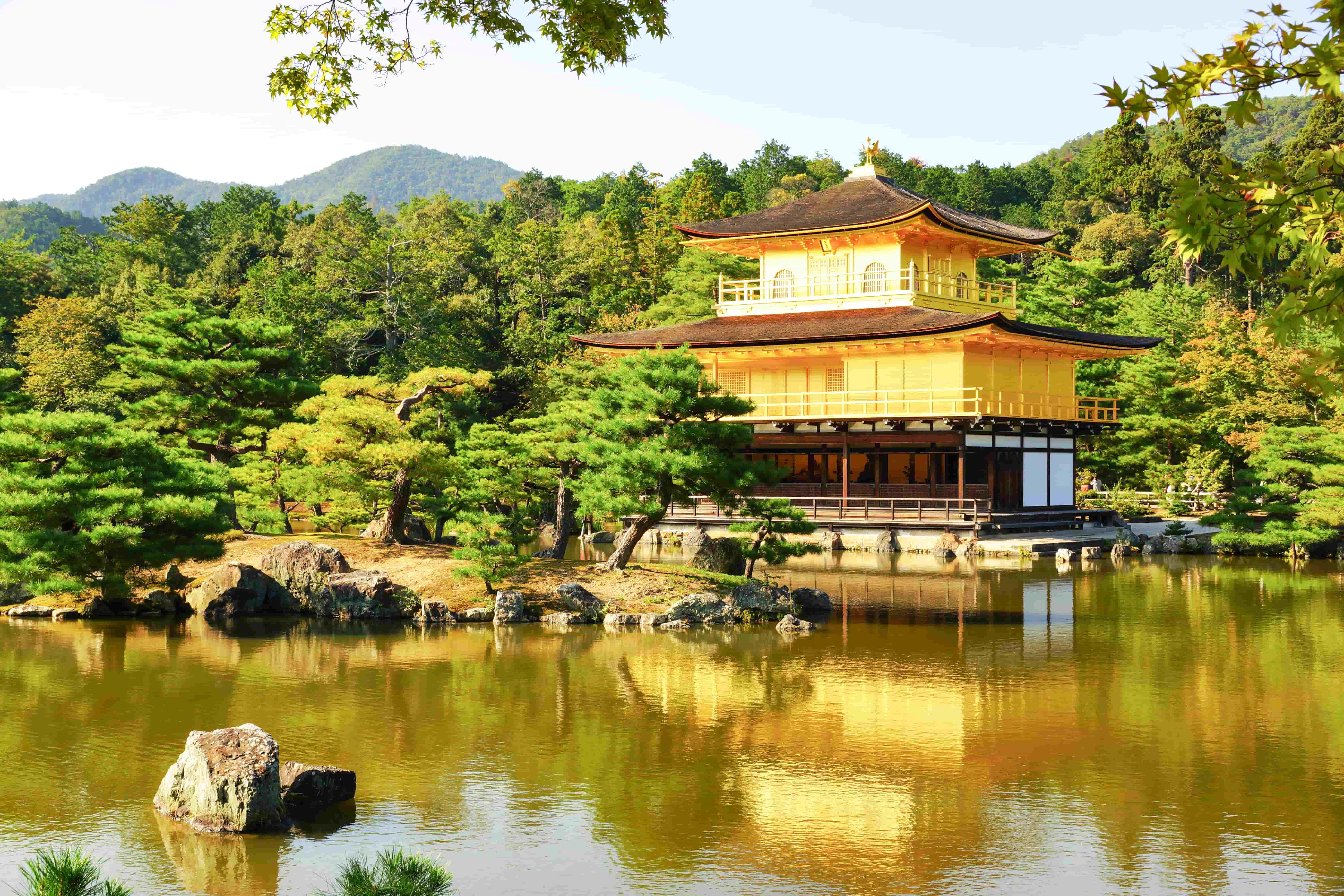 【金閣寺】坐落於京都東北側的金閣寺町,最初是1393年由西園寺公經所建的北山台,室町幕府的第三代將軍足利義滿接管了金閣寺,並在其後更名為北山殿,當作自己的退休用別墅。現在所看到的金閣寺建於1955年,除了覆於上層的金箔是依三島由紀夫所願而增添,其他皆是按照原先的寺廟建築重建而成。而在1987年再度進行修復,這次除了加厚覆於上層的金箔外,另也進行內部結構的強化工程。高12.5公尺的金閣寺,最大特色就是金色亭閣,優雅佇立在滿布荷花的迷人鏡湖池邊。這座寺廟的格局體現了平安時期典型的寢殿造風格,意味著這裡是天地交界之處。木造的金色亭閣樓高3層,而位於上方的2層覆滿眩目耀眼的金箔。每層樓各具特色,亦獨具建築風格。