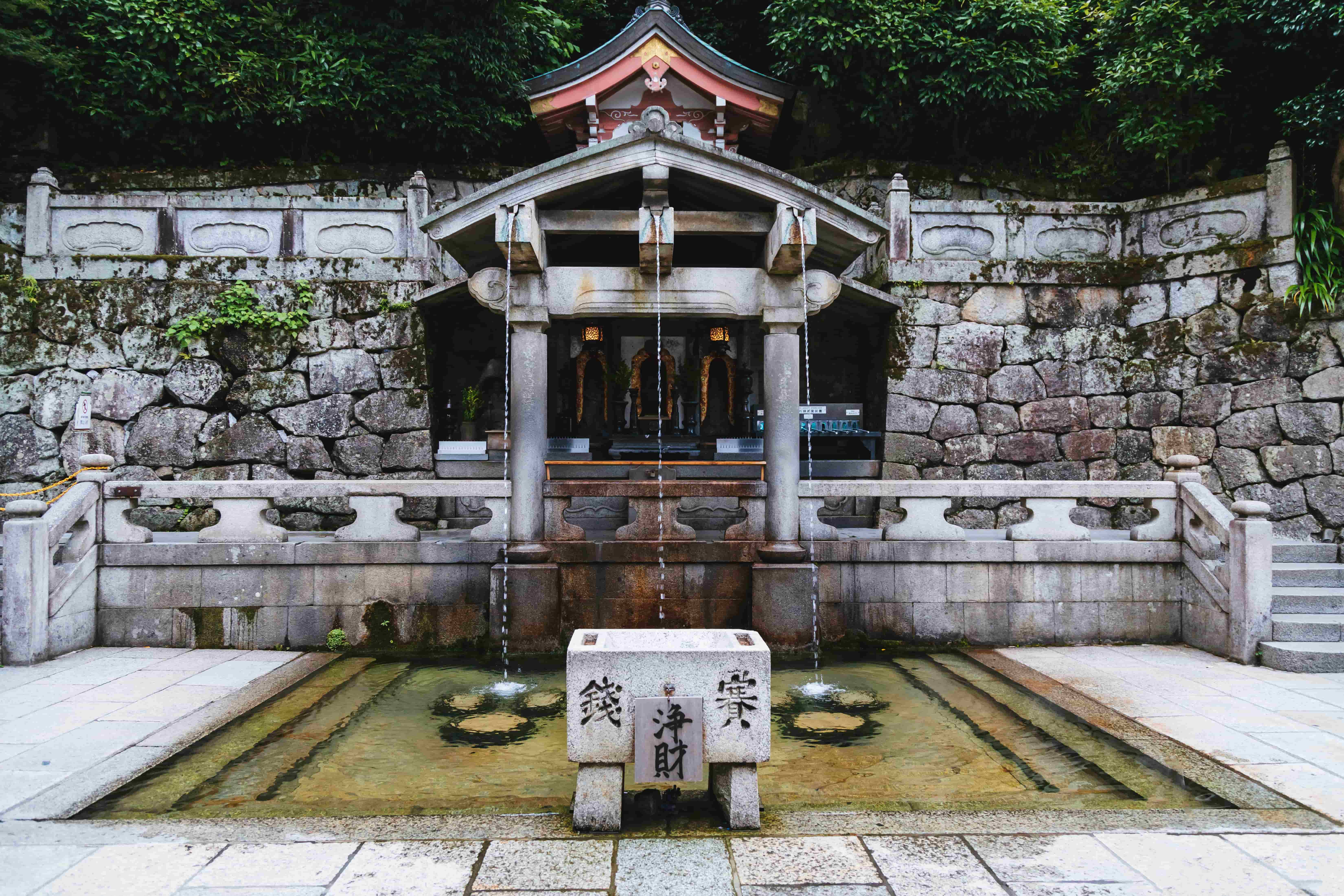 【音羽瀧】清水寺正殿旁有一小山泉瀑布,幾千年來順著音羽山湧出,流水清澈,終年不斷,又被稱為「金色水、延命水」,為日本十大名水之首。面向音羽瀧左邊是學問成就之水、中間是戀愛成就之水、右邊是延長壽命之水。