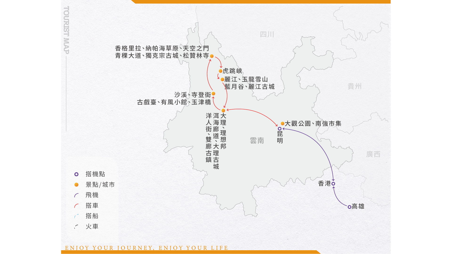 今日於集合於高雄國際機場,搭乘豪華客機經由中轉城市飛往素有「春城」之稱的雲南省省會—昆明。昆明素以「春城」著稱,因其夏無酷暑、冬無嚴寒、氣候宜人,具有典型的溫帶氣候特點。