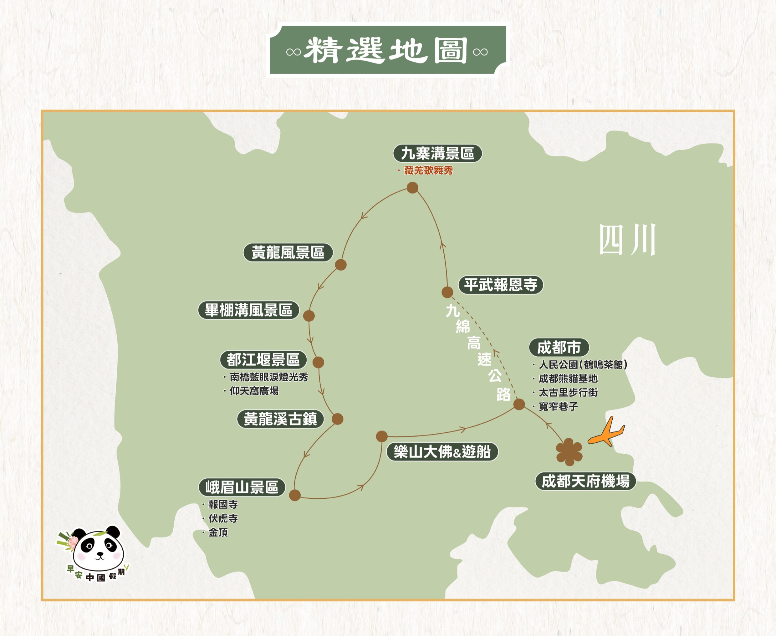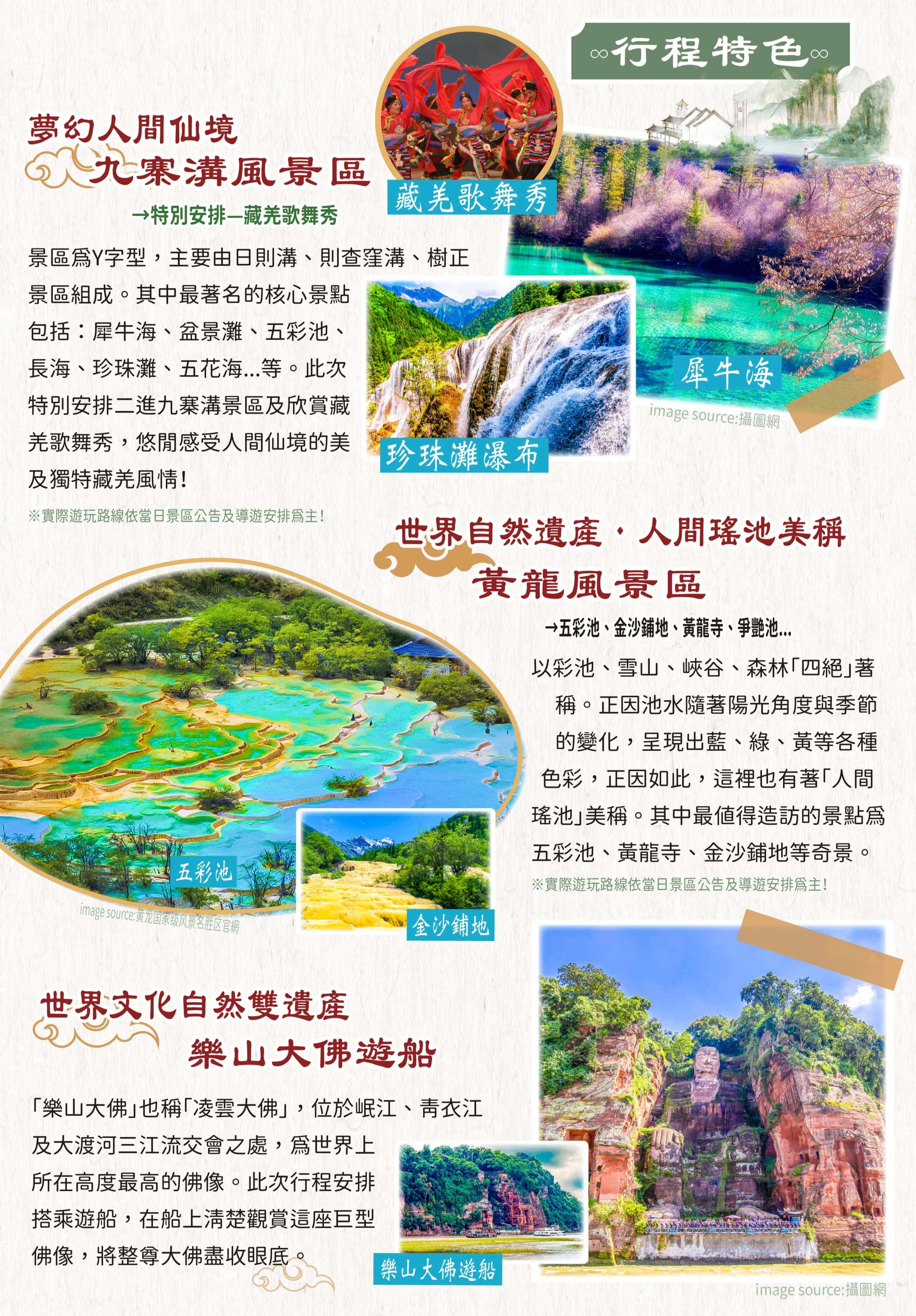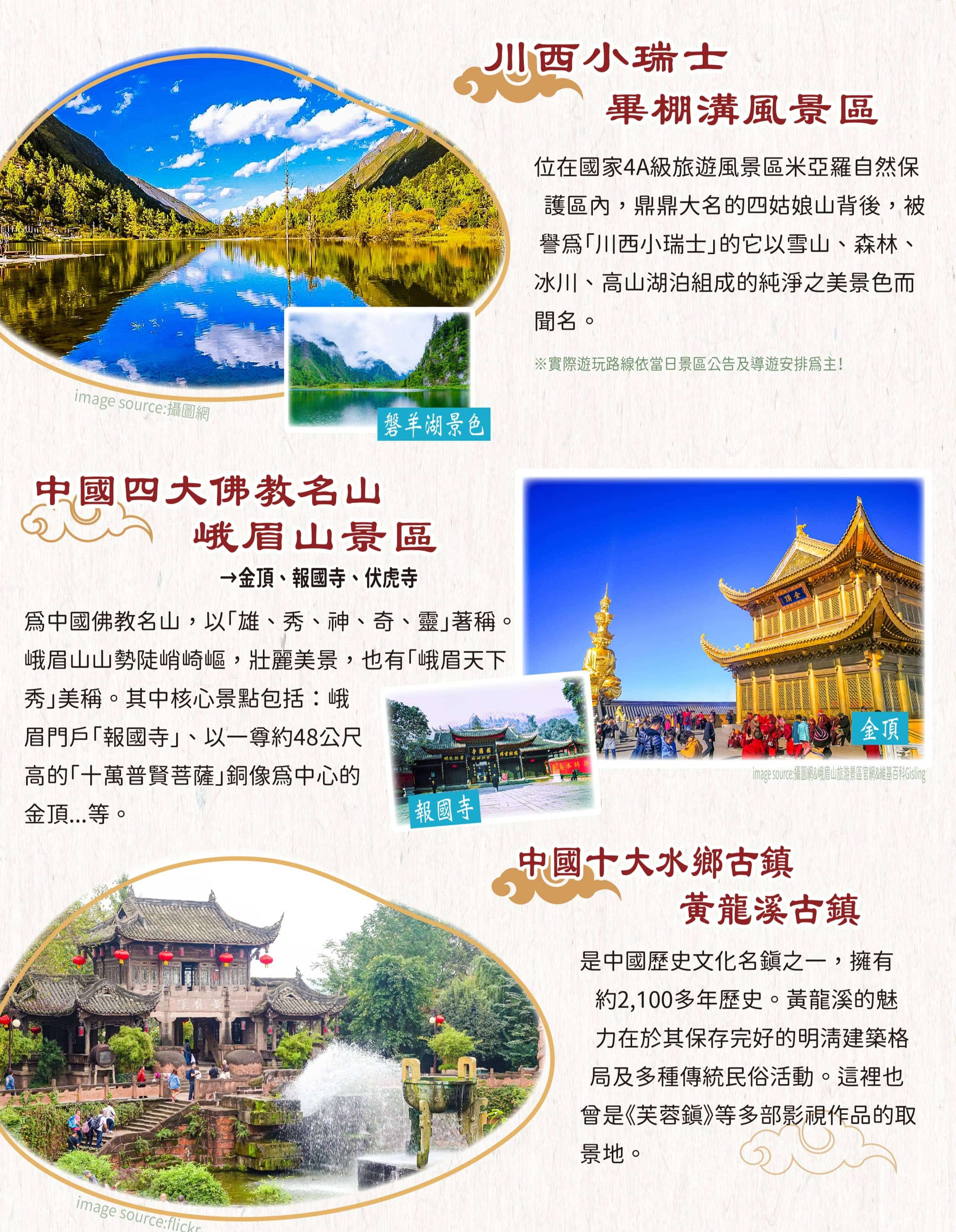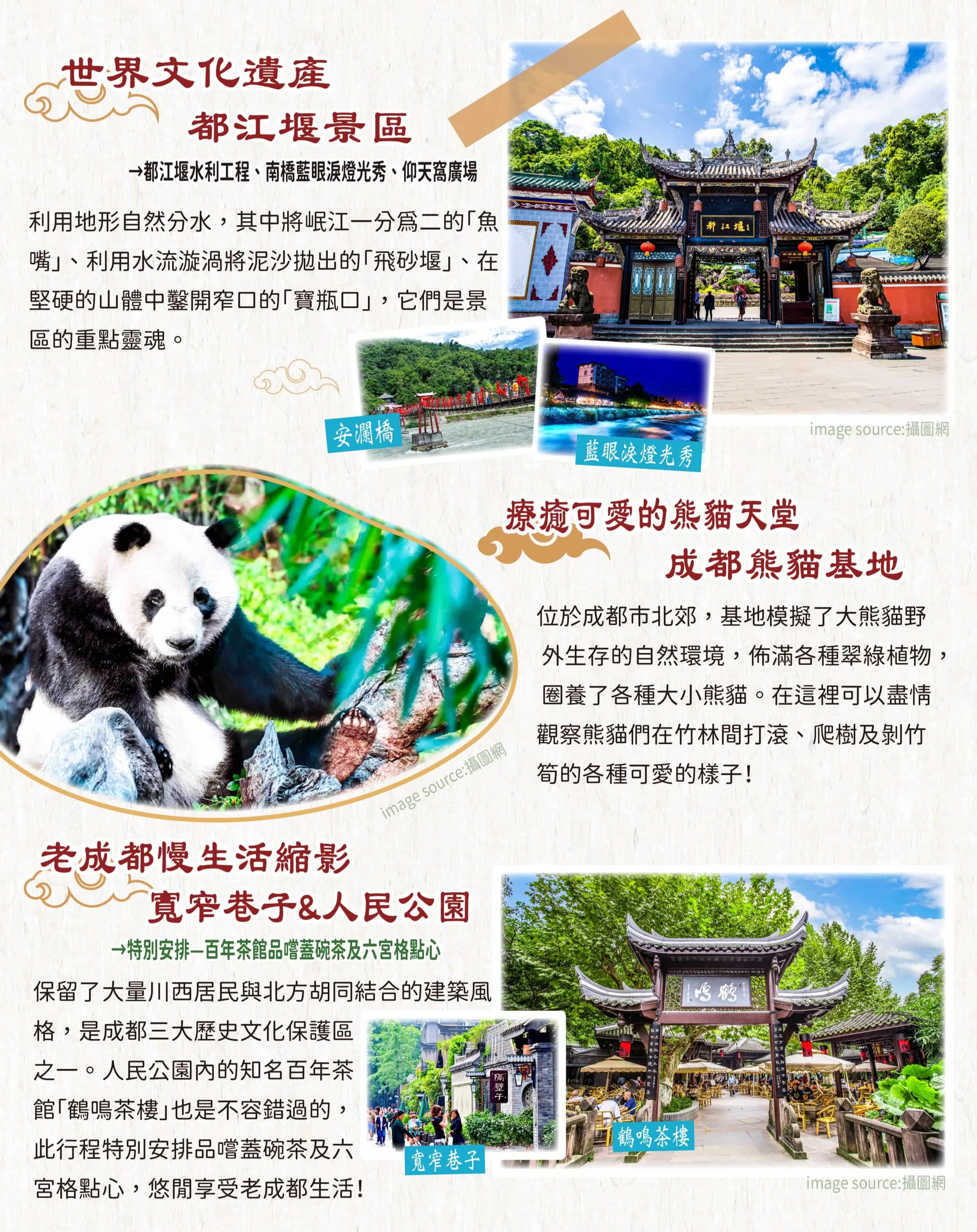 +特別安排二進九寨溝深度旅、藏羌歌舞秀、百年鶴鳴茶館品茗蓋碗茶及六宮格小吃。