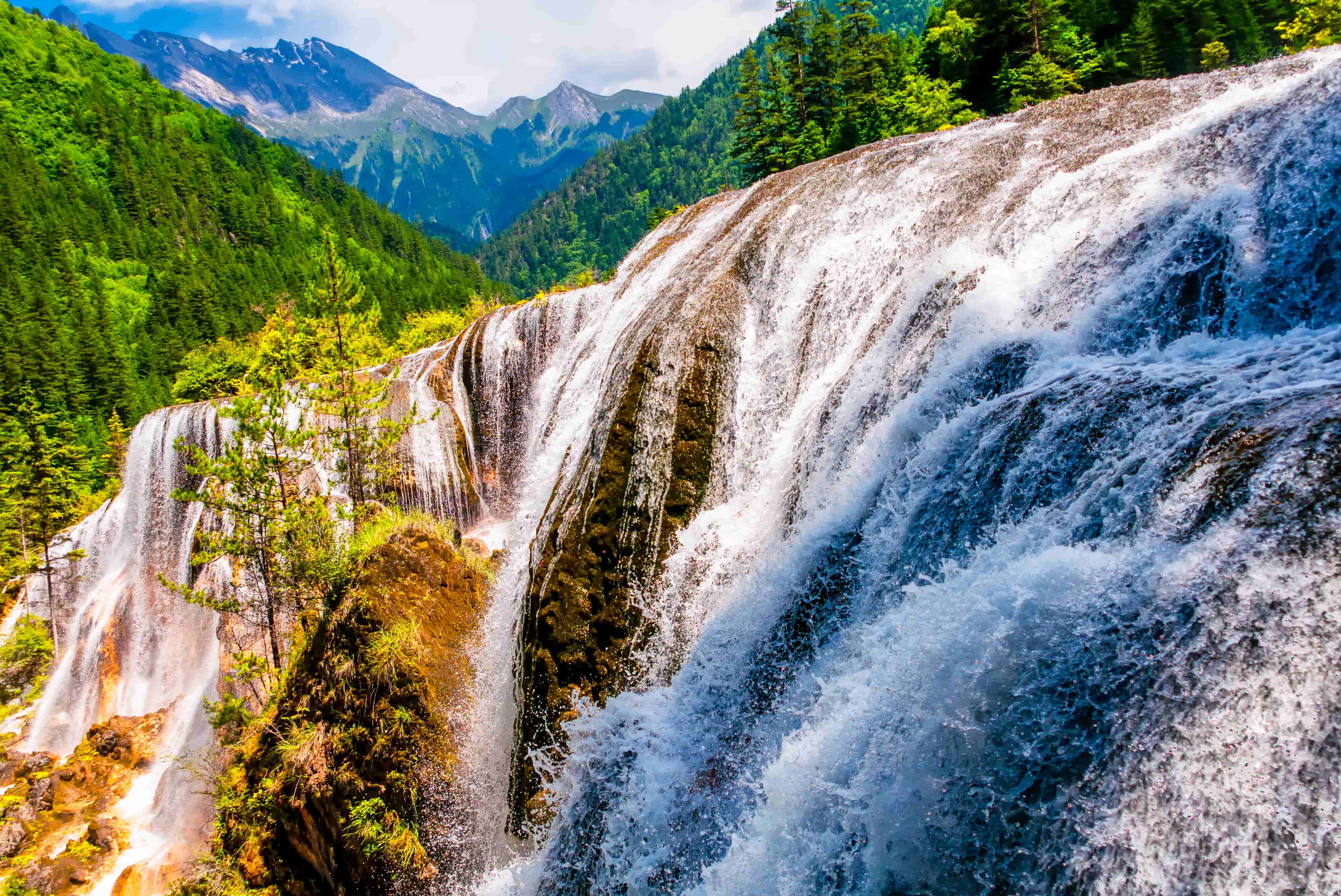 【九寨溝風景名勝區】是大自然鬼斧神工之傑作。四周雪峰高聳,湖水清澈豔麗,飛瀑多姿多彩,急流洶湧澎湃,林木青蔥婆娑。藍藍的天空,明媚的陽光,清新的空氣和點綴其間的古老村寨、棧橋、磨坊,組成了一幅內涵豐富、和諧統一的優美畫卷,歷來被當地藏族同胞視為“神山聖水”。這裏因有九個藏族村寨而得名。共分三條溝:日則溝、樹正溝、則查窪溝3條主溝。景觀分布在樹正、諾日朗、劍岩、長海、扎如、天海六大景區。此外風景的精華是令人歎而觀止色彩斑爛晶瑩透明的108高山海子。九寨溝以高山湖泊群和瀑布群為其主要特點,集湖、瀑、灘、流、雪峰、森林及藏族風情為一體,因其獨有原始自然美,變幻無窮的四季景觀,豐富的動植物資源被譽為「人間仙境」「童話世界」讓您走進九寨溝,將陶醉於最高的美的享受。