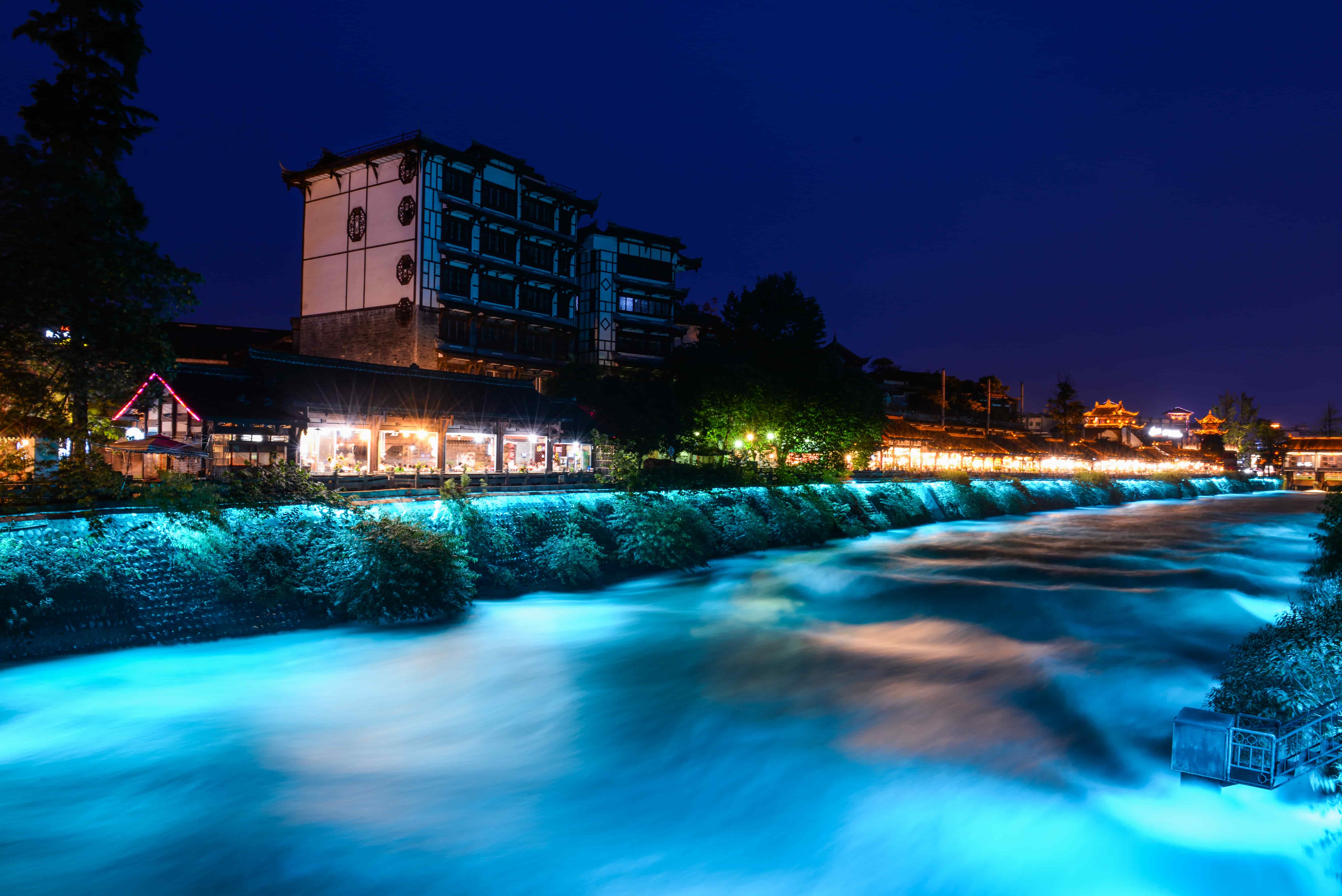 【藍眼淚燈光秀】當夜幕降臨,白天平平無奇的廊橋變得金碧輝煌,燈光把河流染成藍色,整個場景變得如夢如幻。