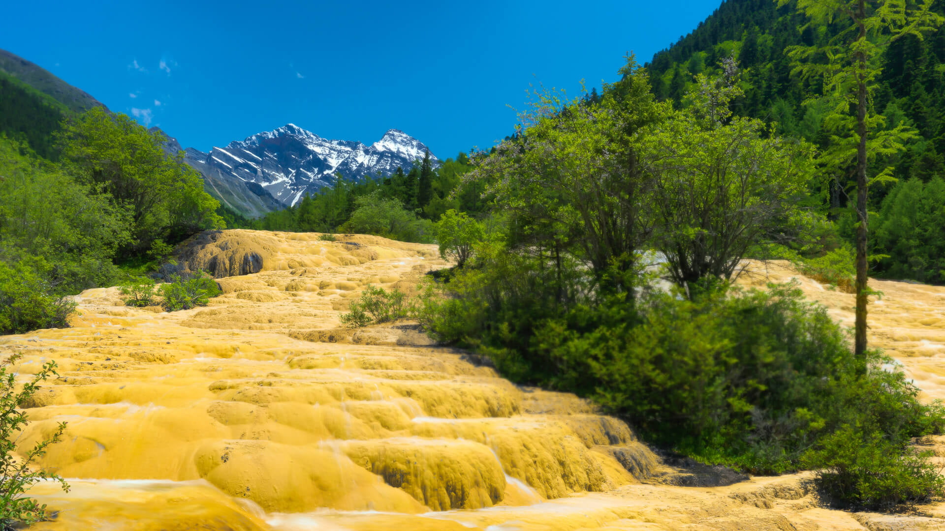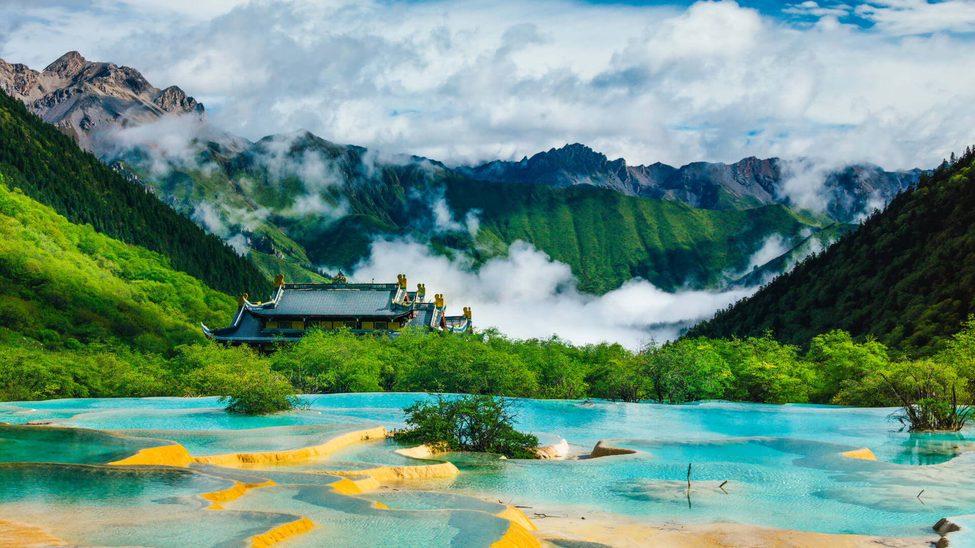 【黃龍風景區】位於阿壩州松潘縣境內,青藏高原的東麓,與九寨溝毗鄰,獨特的地理構造使其形成了曠世奇絕的自然景觀;它以彩池、雪山、峽谷、森林「四絕」著稱於世,壯觀的地表鈣華流蜿蜒於原始林海,酷似一條金色巨龍,騰遊天地,故名「黃龍」,以三千多個五彩斑斕的彩色鈣化池聞名,被譽為「人間瑤池」,與九寨溝毗鄰,1992年列入世界自然遺產,核心景觀為雪寶鼎下的黃龍溝,融合雪山、瀑布、彩池與森林,最高海拔超過 5000 米。