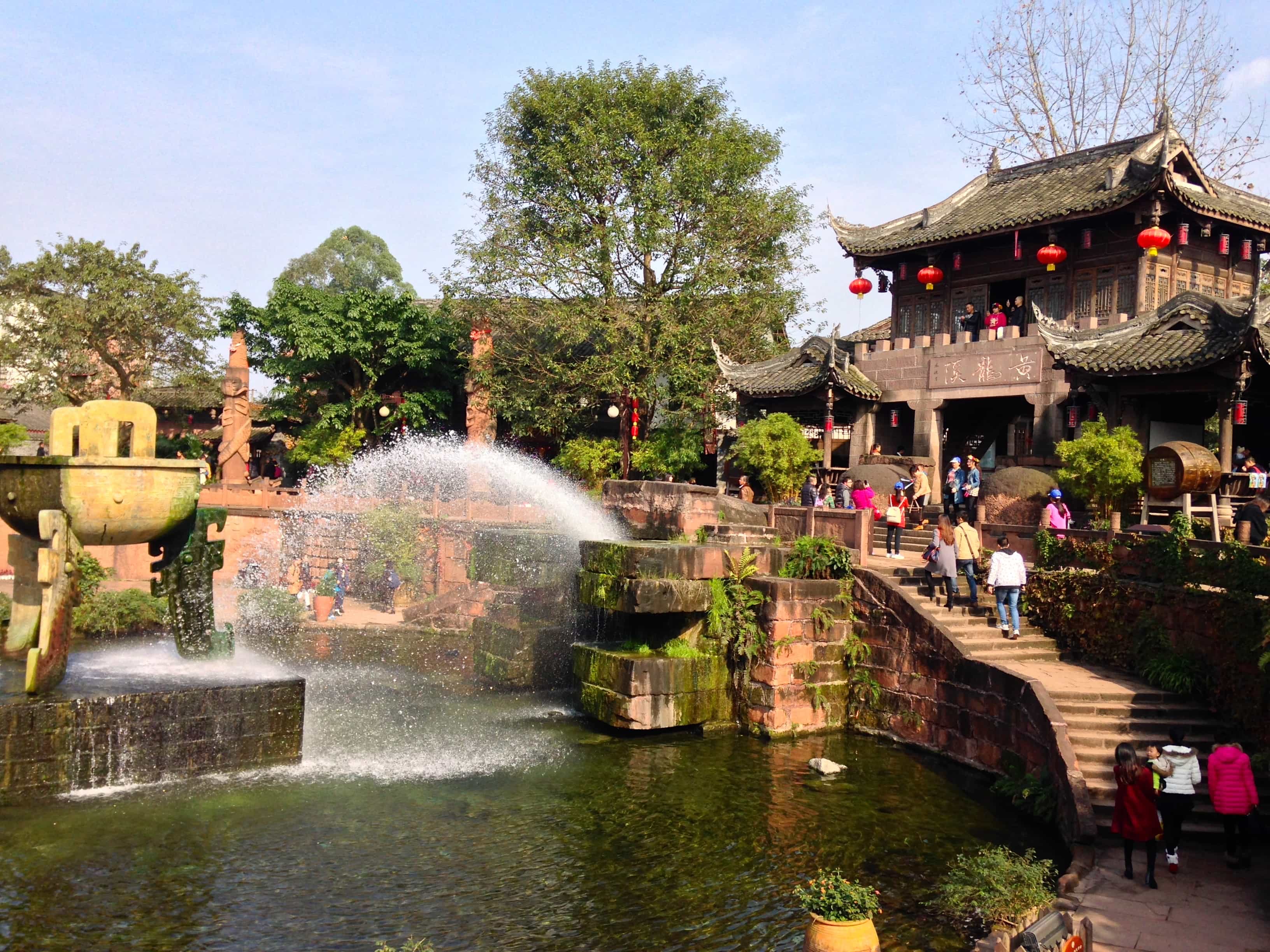 【黃龍溪古鎮】以明清建築、古街、寺廟及「火龍之鄉」民俗聞名,被列為國家4A級旅遊景區,青石板舖的街面、木柱青瓦的樓閣房舍、鏤刻精美的欄杆窗櫺,無不給人以古樸寧靜的感受,鎮內有6棵樹齡在300年以上的黃角樹,枝繁葉茂,遮天蔽日,給古鎮更增添喧鬧場面與現代大都市形成鮮明的對比。
