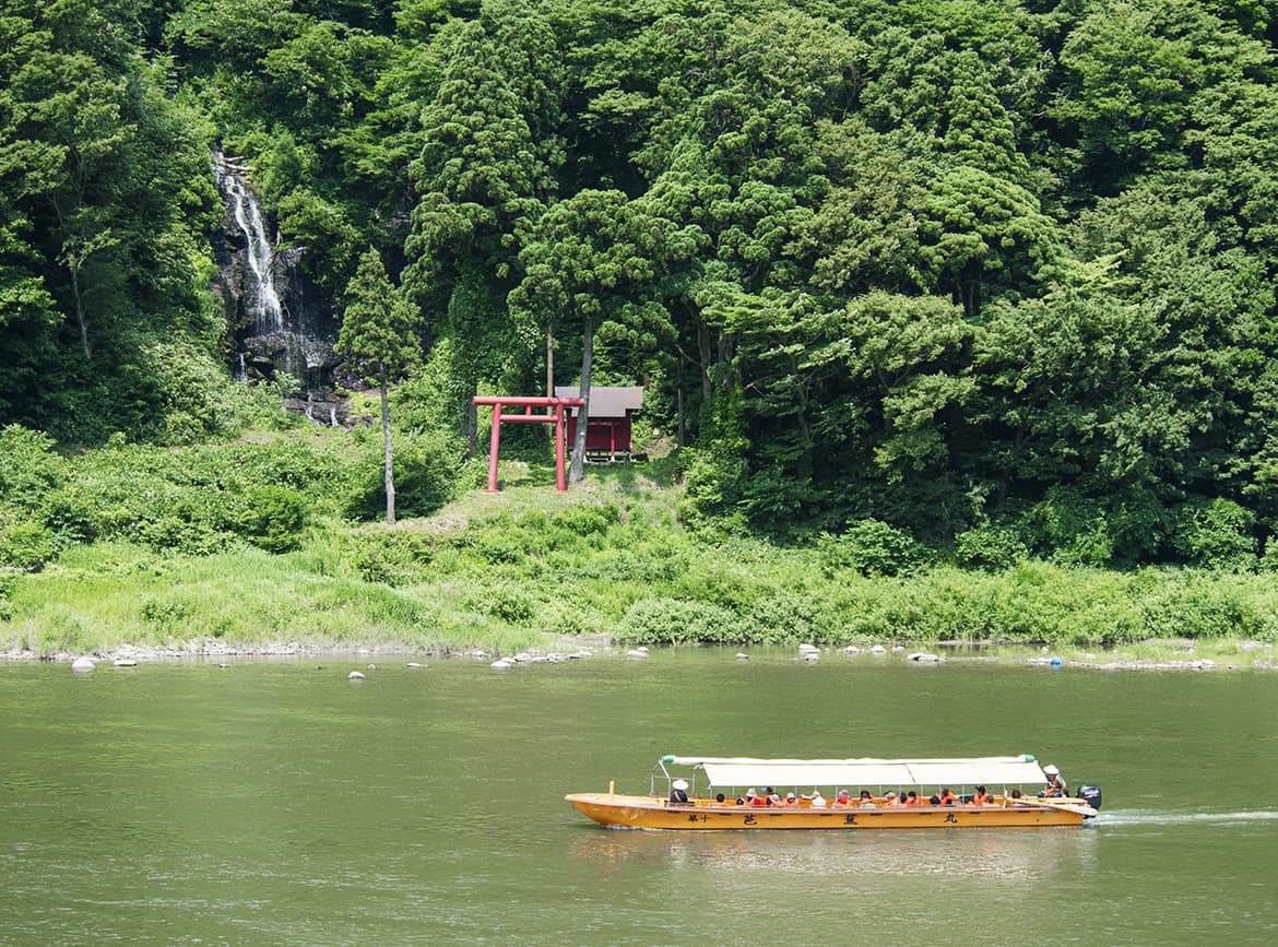 【最上川遊船】最上川是日本三大急流之一,縱貫山形縣境內,最後流入日本海,全長229公里。一年四季有著不同的風光,春天伴隨著櫻花的粉嫩;夏天是一片翠綠山巒;秋天則有深深淺淺的楓紅;冬天覆蓋上銀白的霜雪。在壯大的山崖景色中,一邊聆聽著船夫清脆美妙的嗓音唱著當地的民俗歌謠,彷彿時光停滯了下來,忘卻了所有的煩憂。