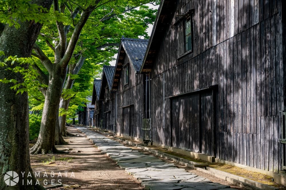 【山居倉庫】是建於1893年的米倉,雙層屋頂取代隔熱材,內側並種有櫸樹以遮蔽西曬、強風,先人利用大自然的智慧令人敬佩。即使是在冰箱等技術發達的今天,傳統巧思及機關繼續保護白米不受濕氣、熱氣影響。倉庫正面正對河岸,三角形屋頂、白牆與倒映在河面上的倉庫,面對最上川的碼頭,還有運米的小鵜飼船等,有趣的風景眾多。倉庫後方則有櫸木行道樹,與黑板牆、石板路相映成趣,非常上相。新綠的櫸樹,白雪覆蓋下的三角屋頂,燈光亮起的黃昏,及被雨水淋濕的石板路等,風光隨季節、時段變換。