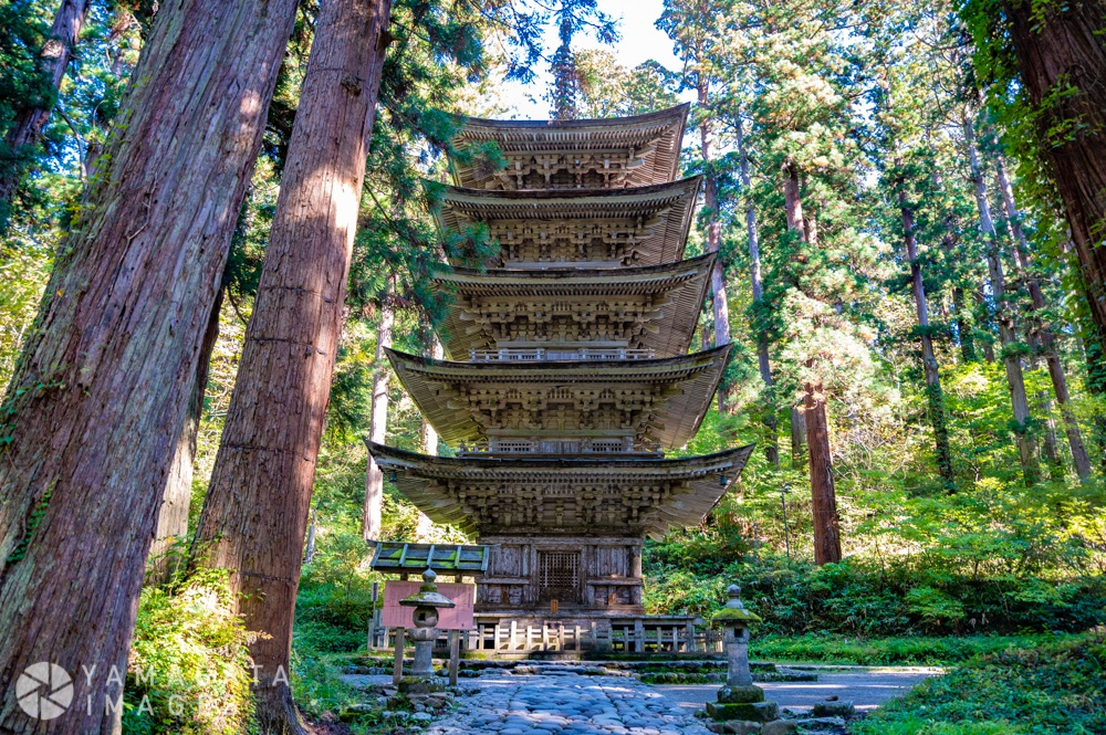 【羽黑山五重塔】海拔僅約414公尺的羽黑山,境內有著一條2466級階梯的參拜步道,從隨神門開始一路起起伏伏地綿延至山頂的出羽三山神社。這條參拜道高聳巨大的杉木遍佈兩側,途中更林立著約20座的小寺廟,以及1座東北地區唯一的國寶五重塔;開山1400多年以來,吸引無數修行者來此朝山祈福。
